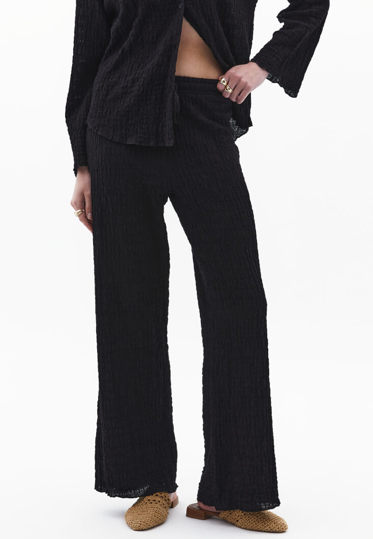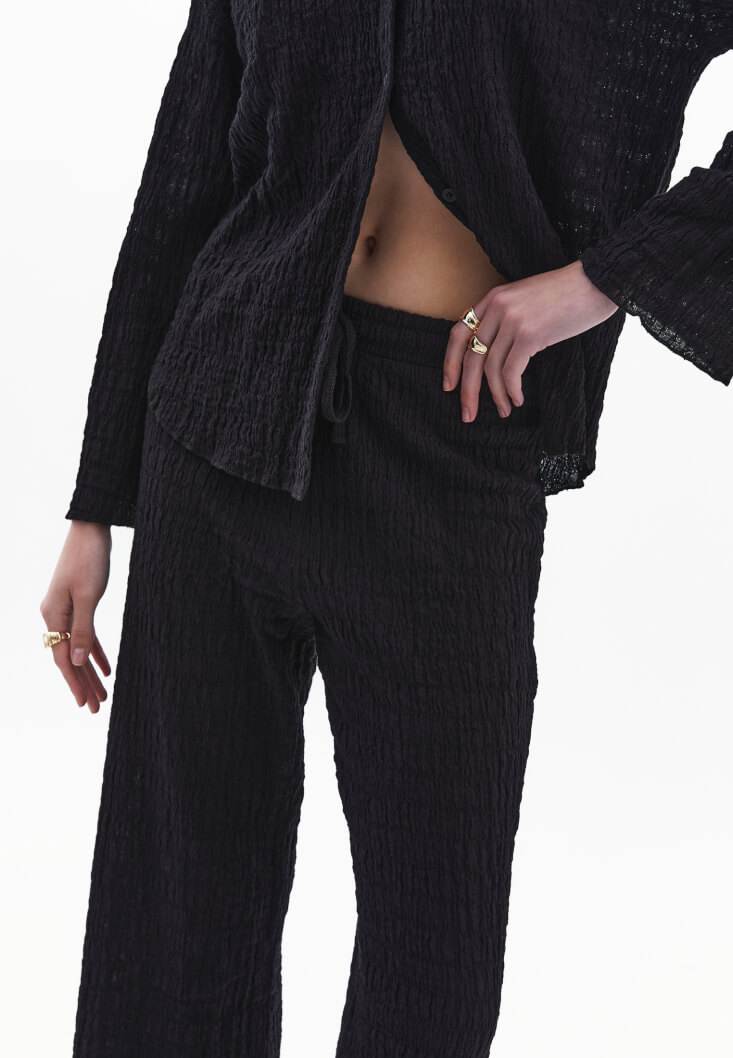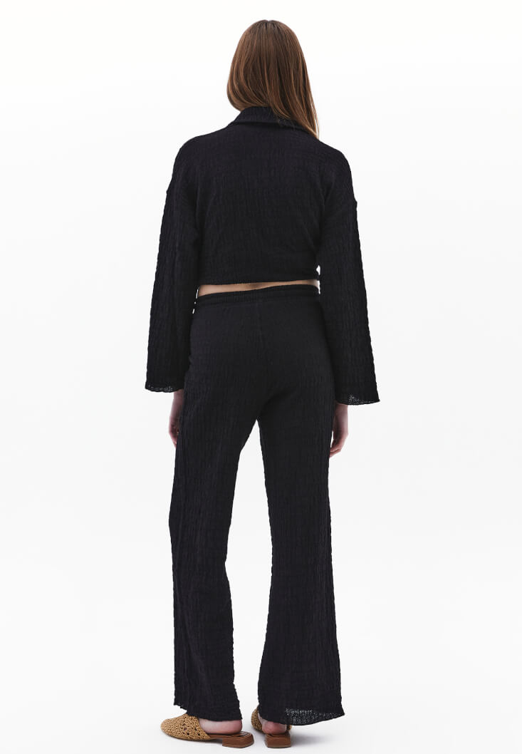 Pamuk karışımlı örme doku, yüksek bel, bol paça, bedenden uzak rahat fit, beli lastikli ve bağcıklı, içi kısa astarlı.
