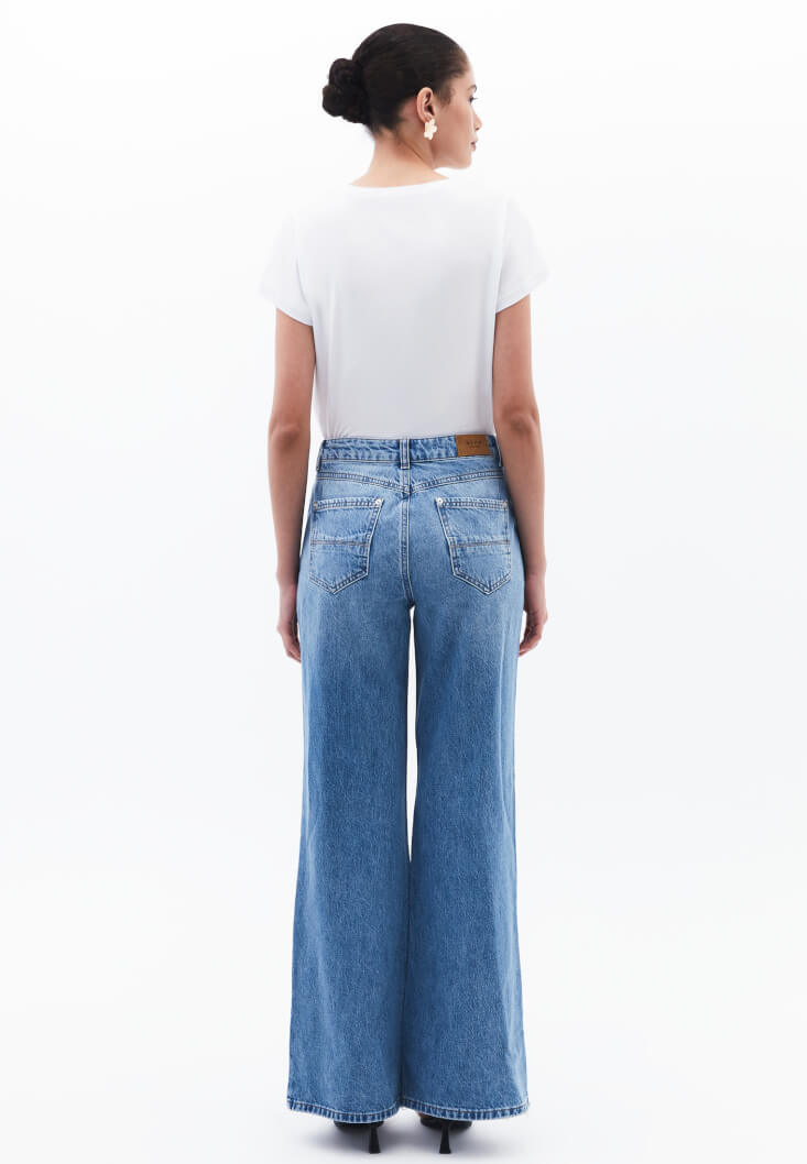 Geniş paça kesimiyle güçlü bir duruş sergileyen bu pantolon, yüksek bel formu sayesinde bel hattınızı vurgularken boyunuzu daha uzun gösterir. Denim dokusu ile zamansız bir stile sahip olan bu tasarım, rahat kalıbıyla gün boyu konfor sunar.
