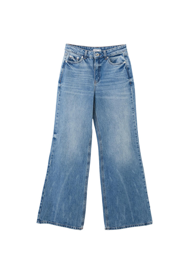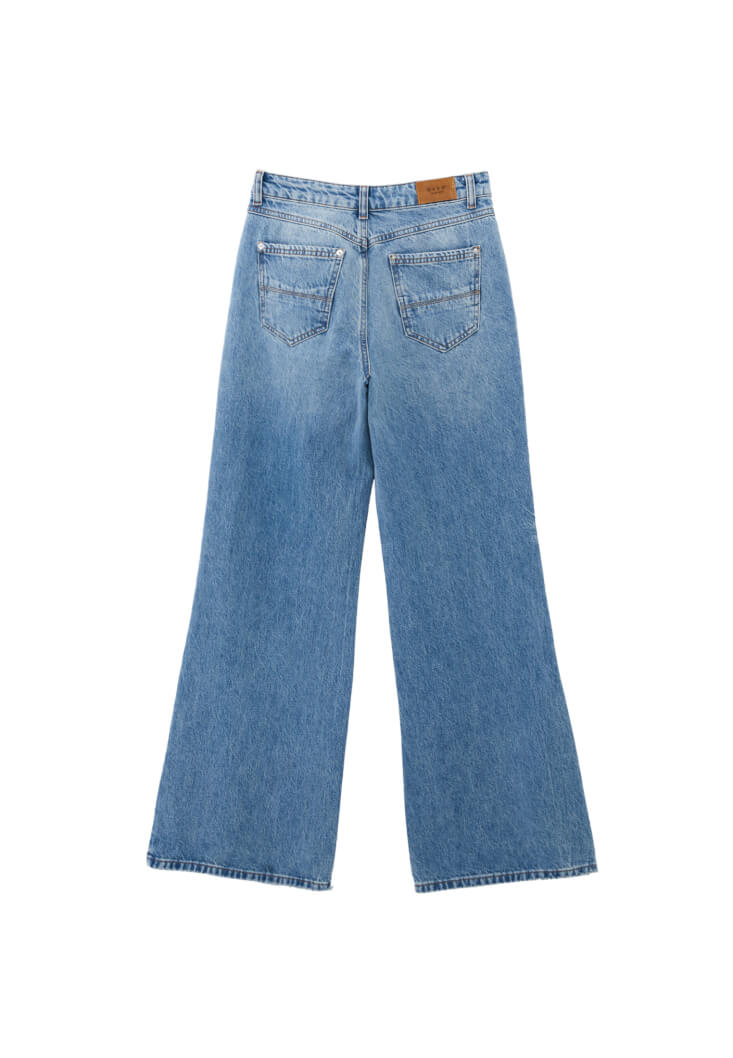 %100 pamuk içerikli doğal doku, yıkamalı denim, yüksek bel, bedenden uzak rahat fit, bol paça, önü ve arkası ikişer cepli.