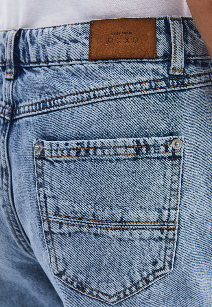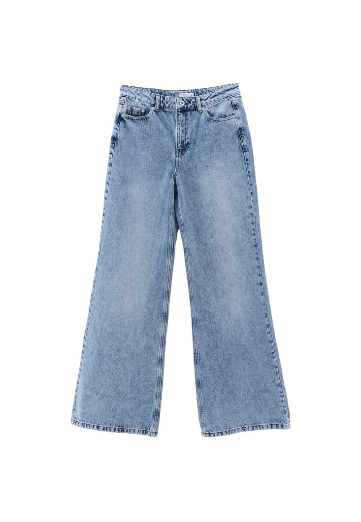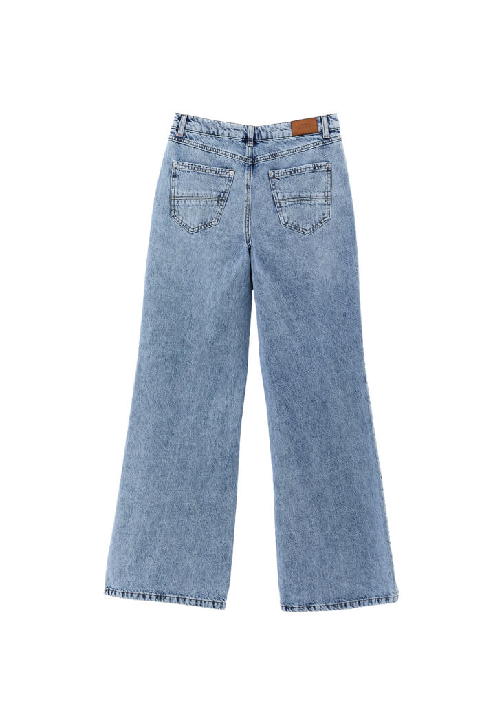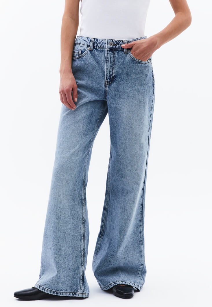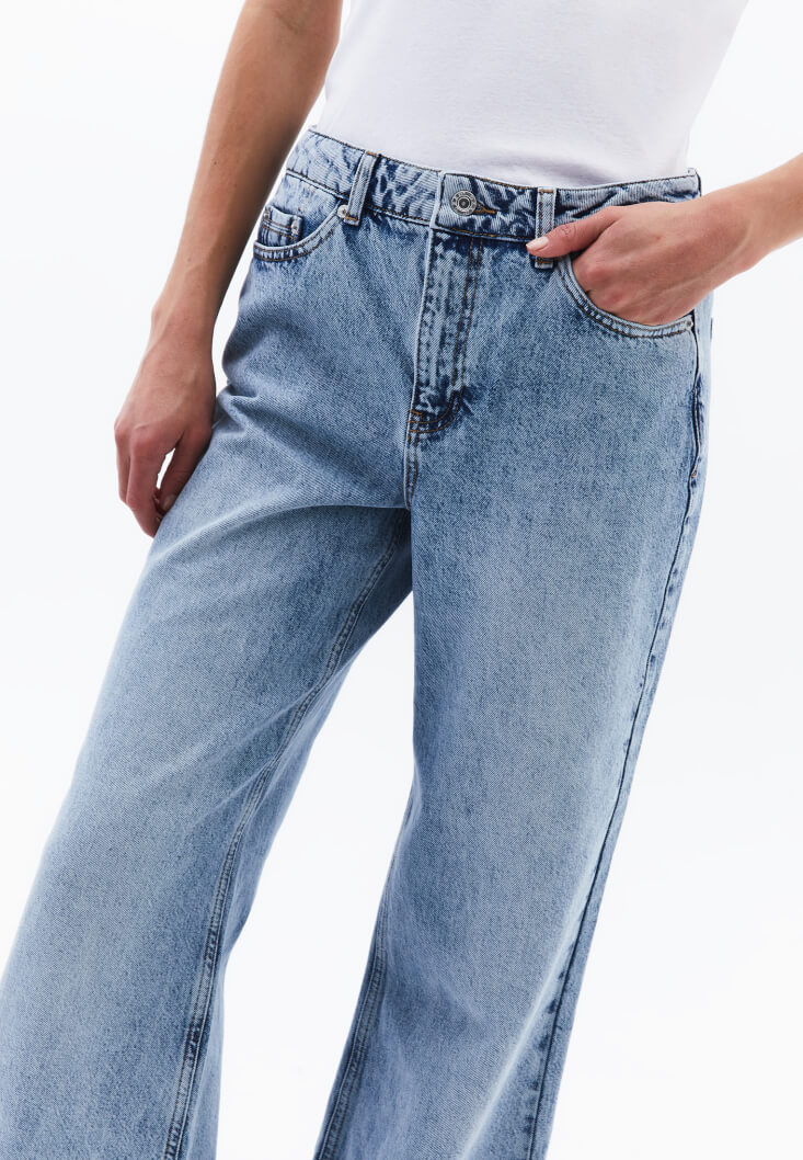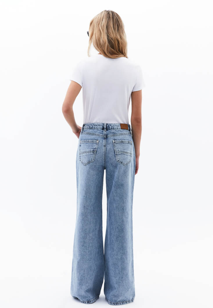 %100 pamuk içerikli doğal doku, yıkamalı denim, yüksek bel, bedenden uzak rahat fit, bol paça, önü ve arkası ikişer cepli.