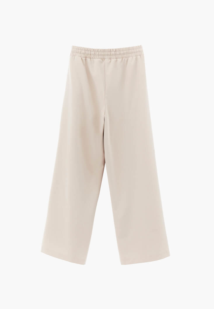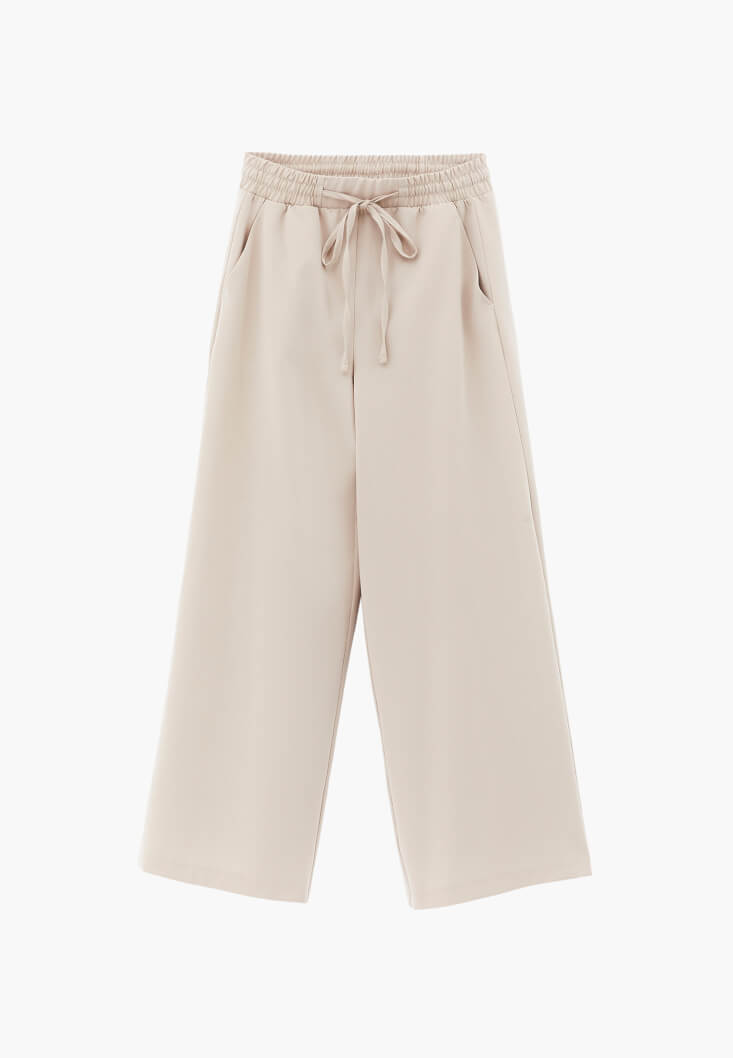 Viskon karışımlı akışkan doku, bedenden uzak rahat fit, yüksek bel, bol paça, beli lastikli ve bağcıklı, iki cepli.