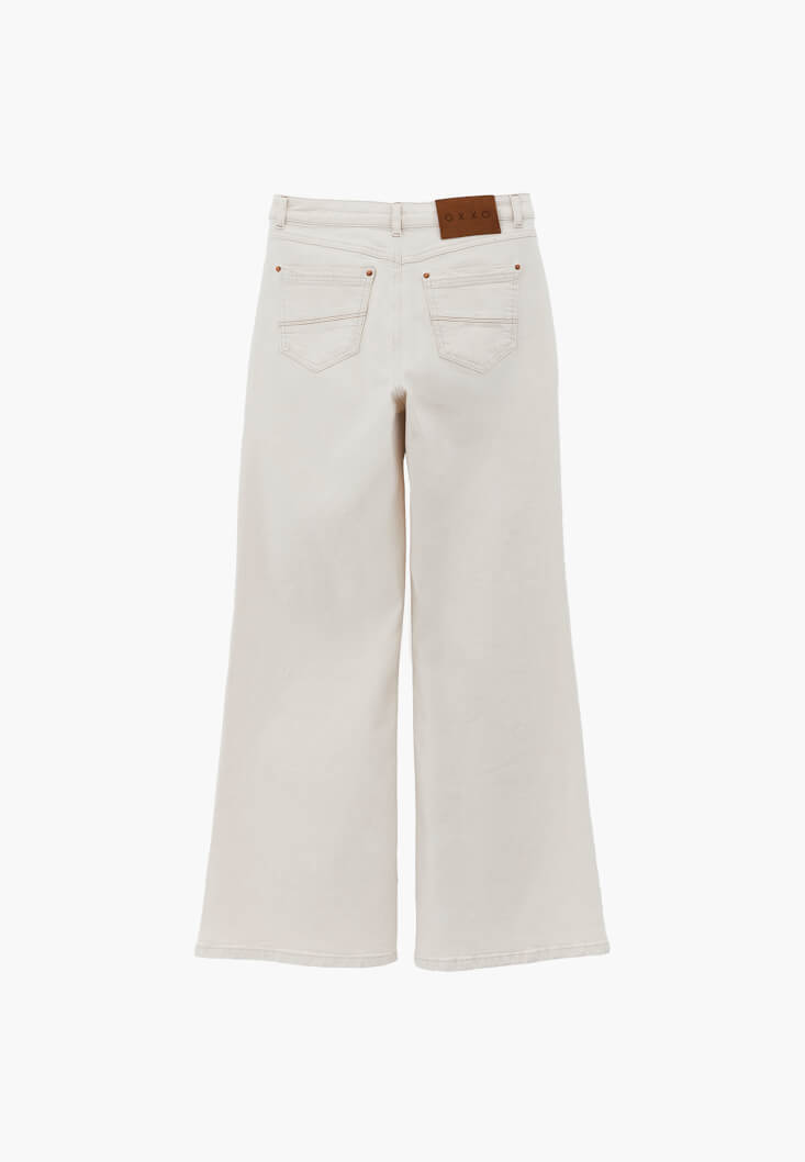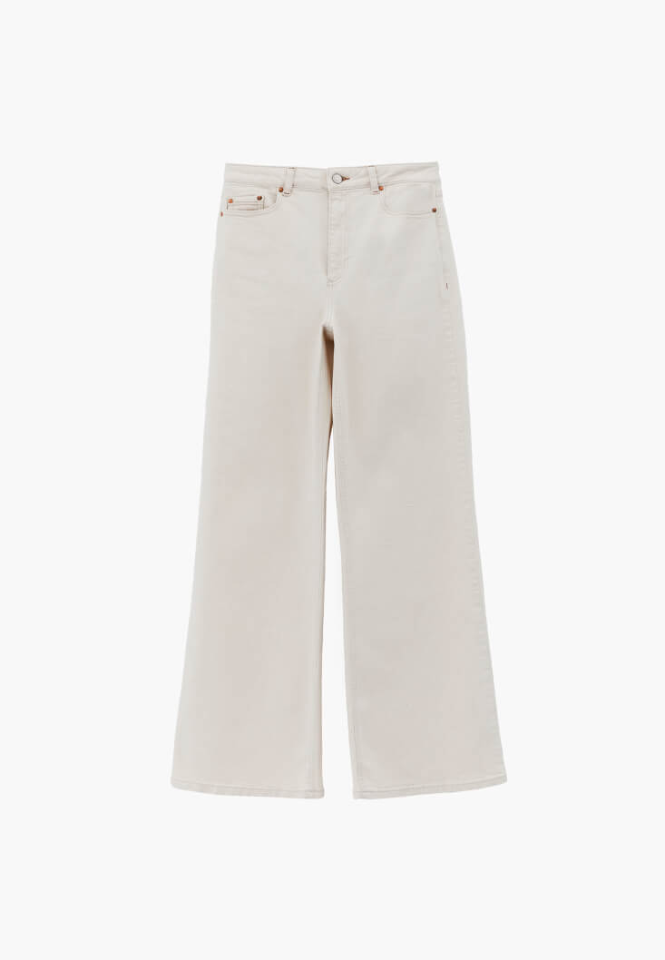 Yüksek pamuk karışımlı denim, yüksek bel, bedene yakın rahat fit, bol paça, önü ve arkası cep detaylı.