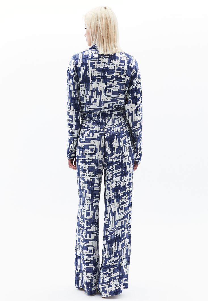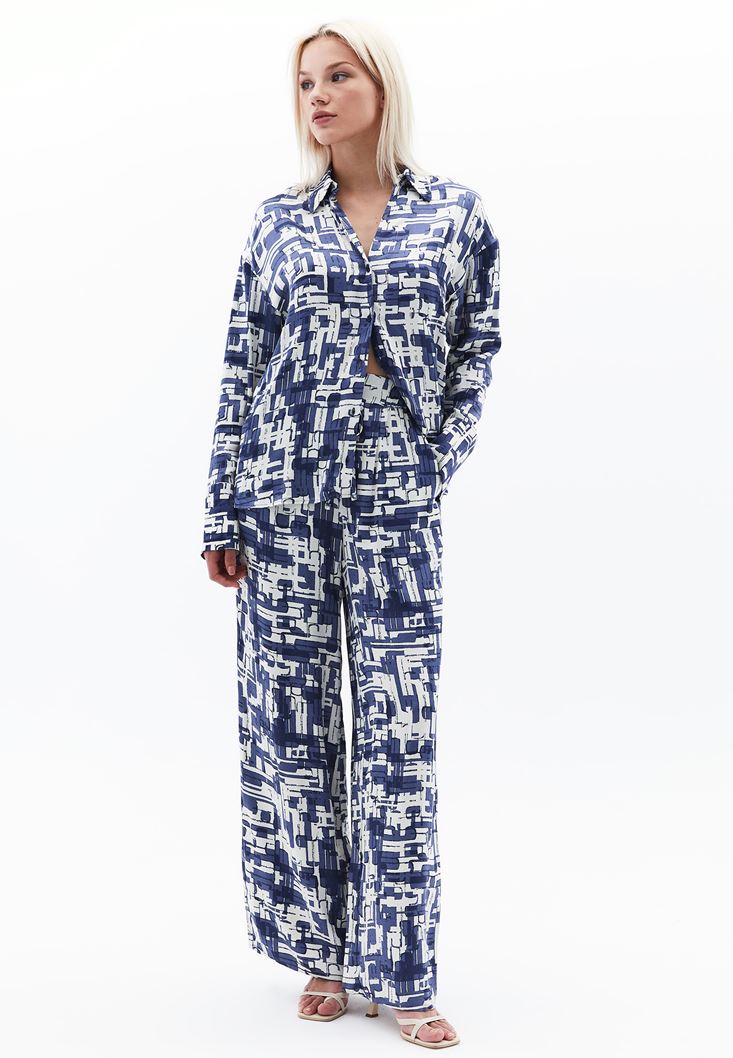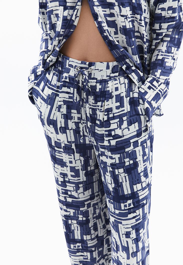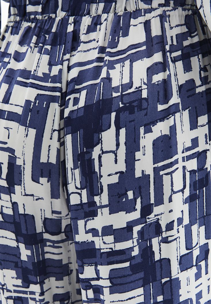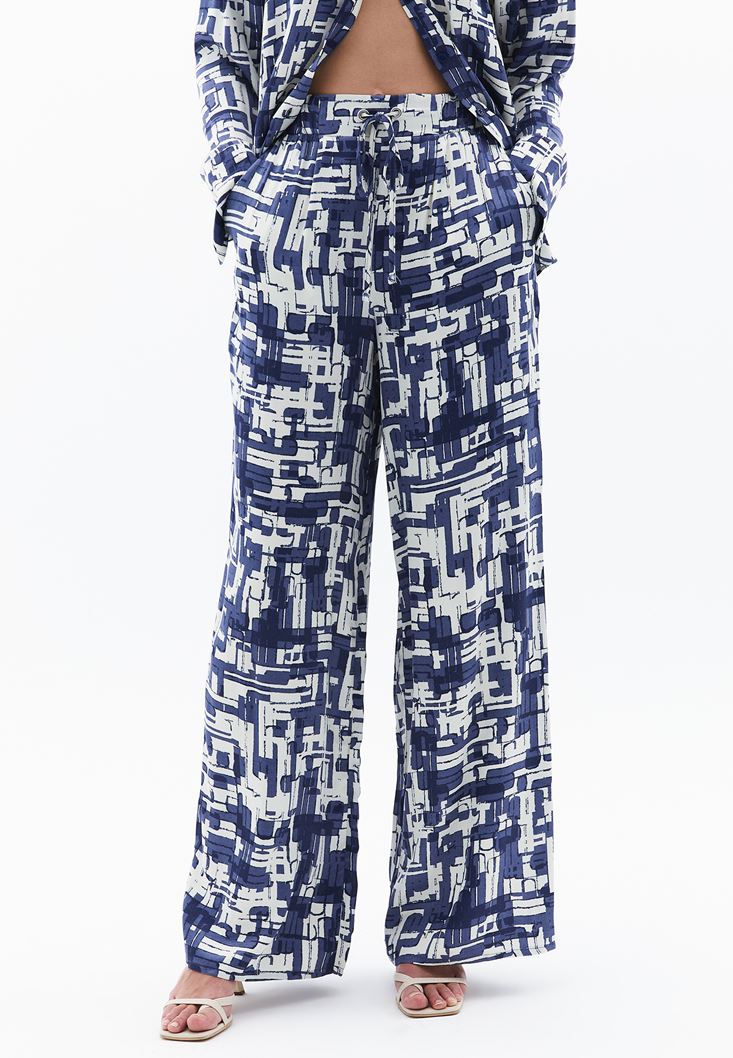 %100 viskon içerikli saten doku, mix desenli, yüksek bel, bol paça, bedenden uzak rahat fit, beli bağcıklı ve arka bel kısmı lastikli, iki cepli.