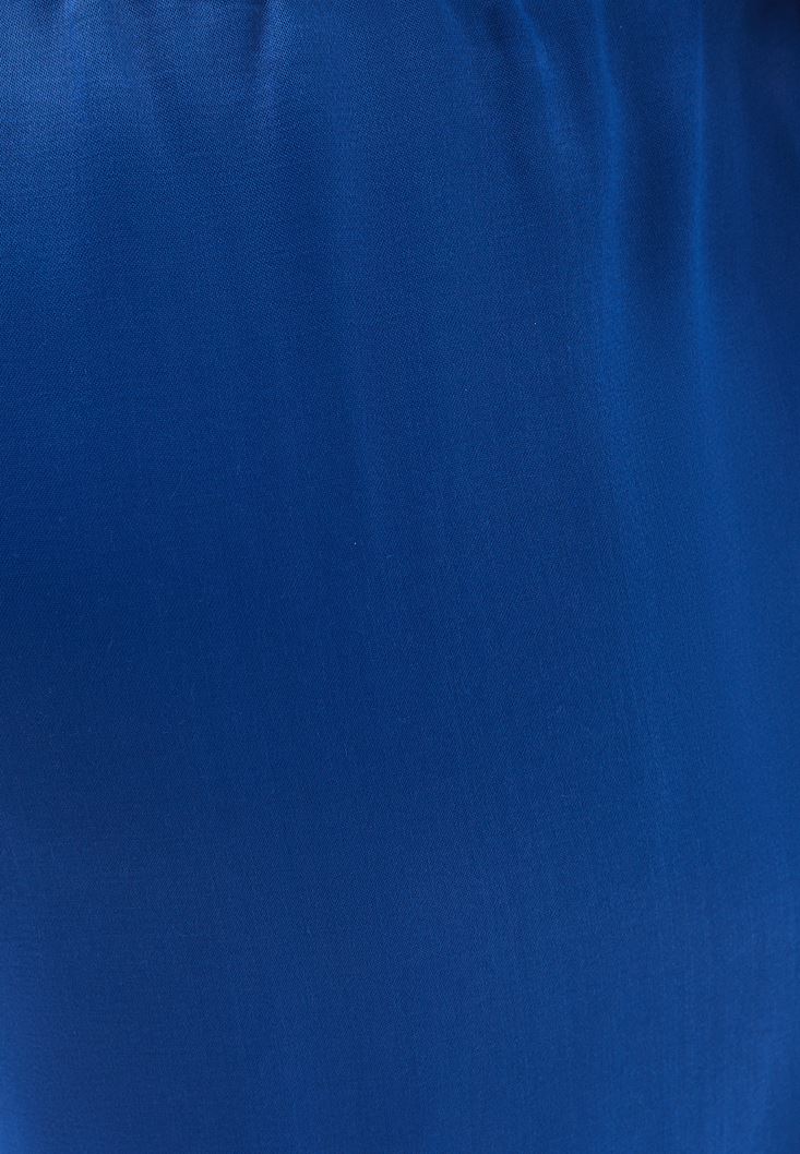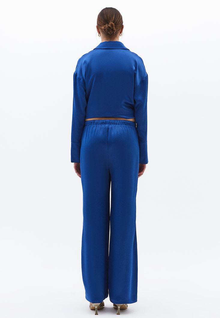 Mavi Yüksek Bel Wide-Leg Saten Pantolon