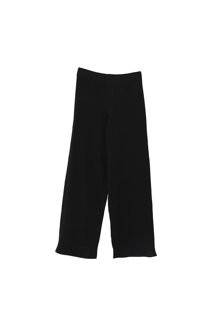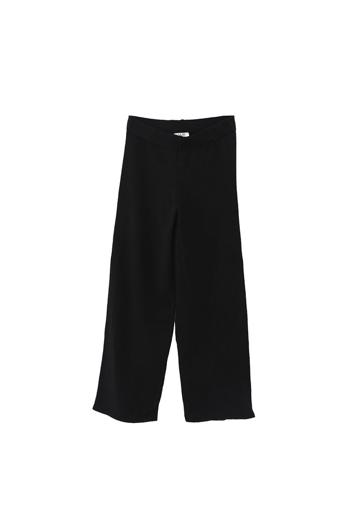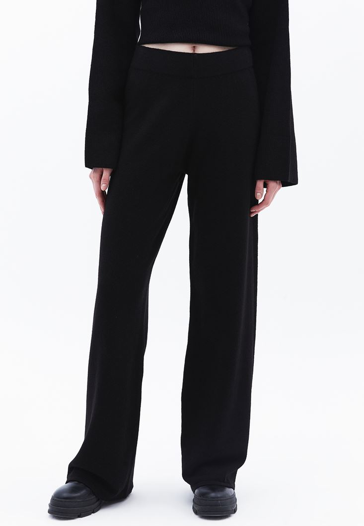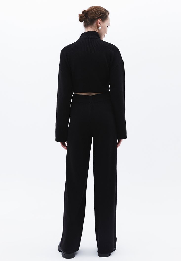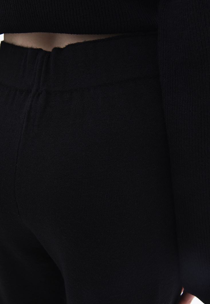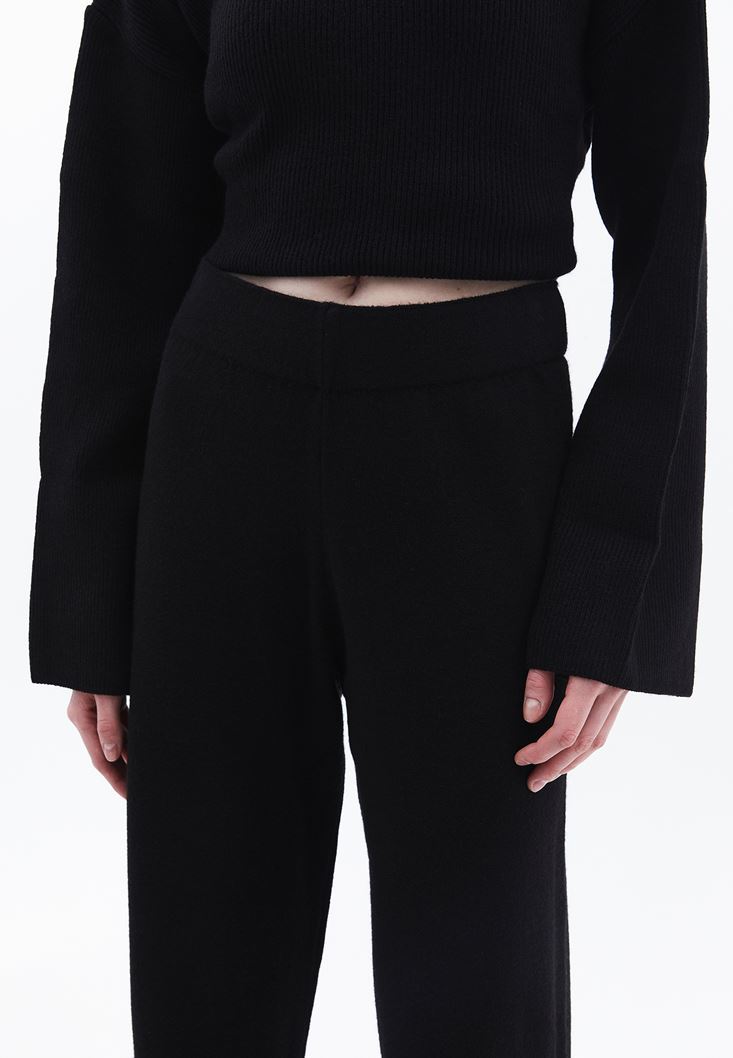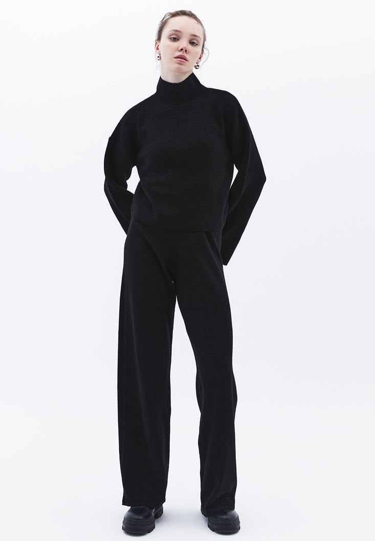 Siyah Yüksek Bel Wide-Leg Triko Pantolon