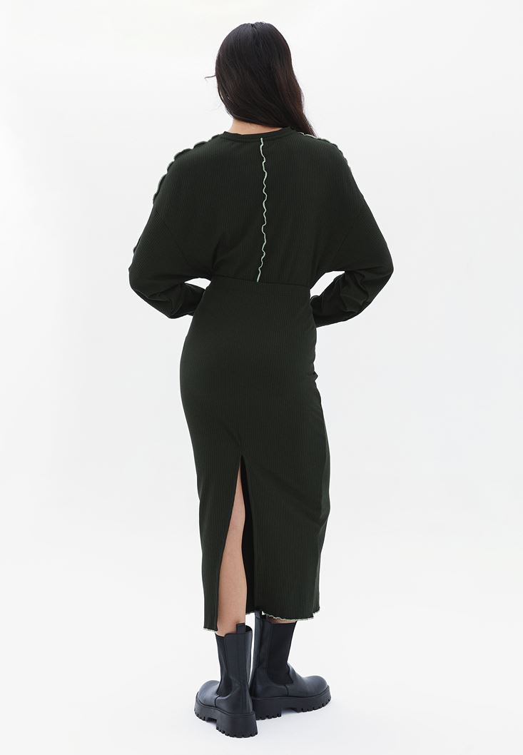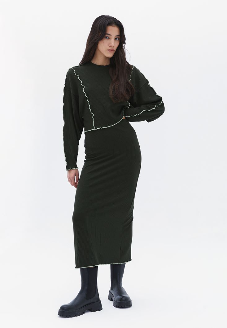 Yeşil Yüksek Bel Yırtmaç Detaylı Etek