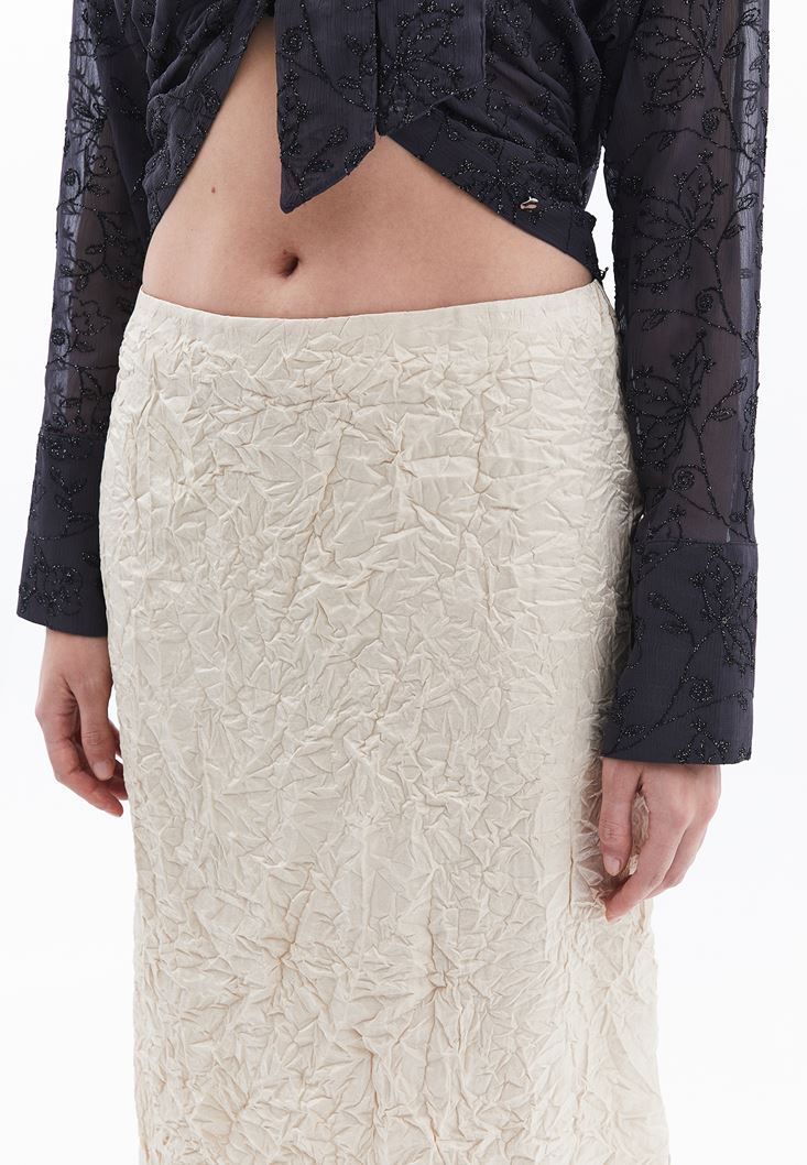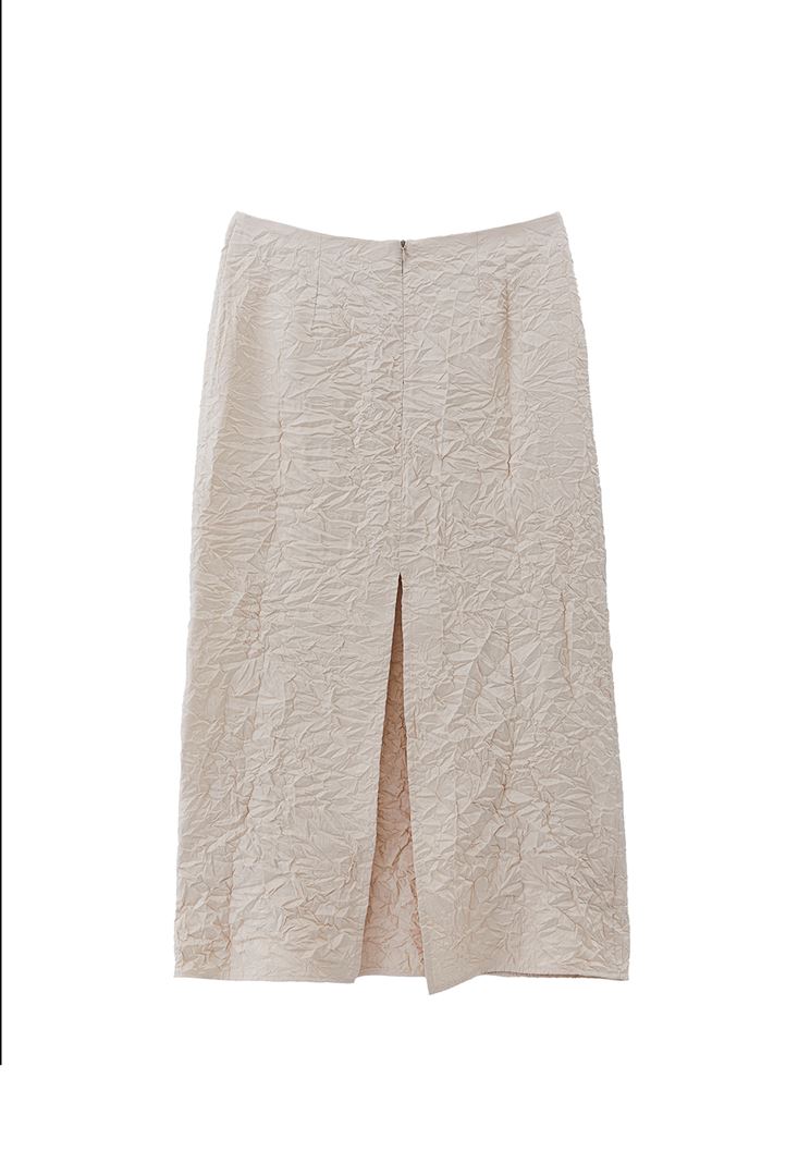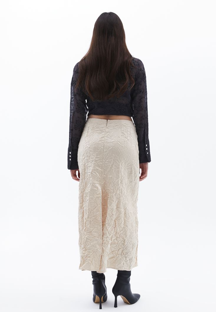Viskon karışımlı içerik, crush görünümlü doku, yüksek bel, bedene yakın rahat fit, arka bel kısmı fermuar kapamalı, arka bölüm tek yırtmaçlı, uzun boy kesim.