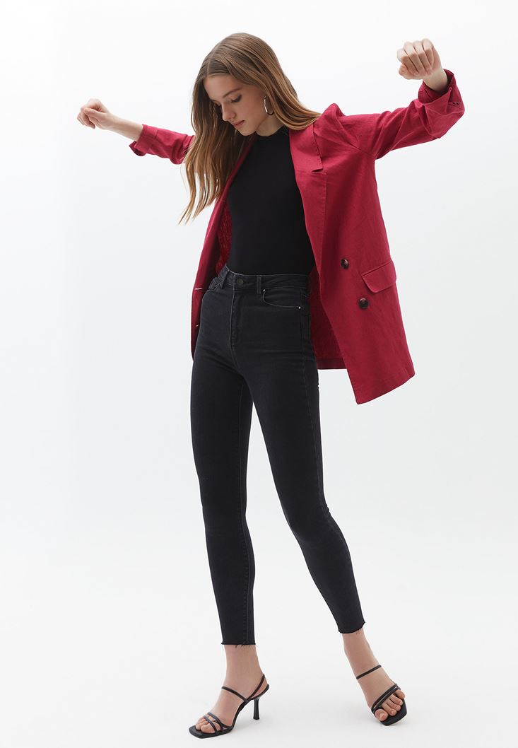 Viskon karışımlı fitilli doku, bedeni saran esnek fit, yüksek yaka, standart boy.