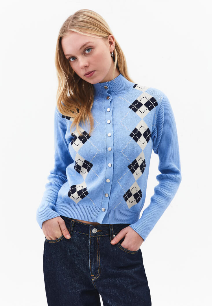 Yüksek Yaka Jakarlı Hırka – Geometrik Desenler, Modern Konfor