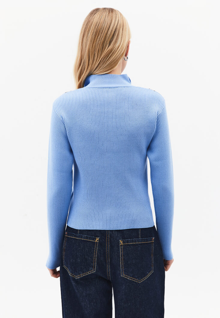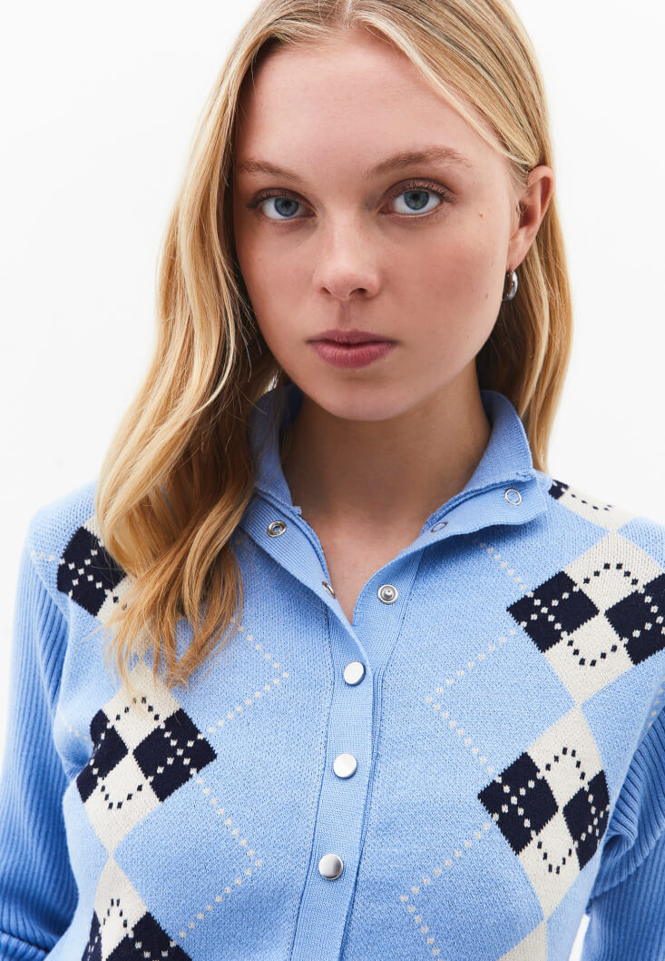 Viskon karışımlı triko, baklava desenli, bedeni saran fit, uzun kollu, yüksek yaka, çıtçıt kapamalı, yaka/kol/etek ucu jakarlı.