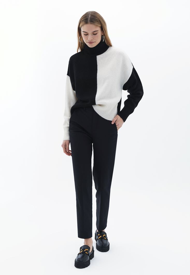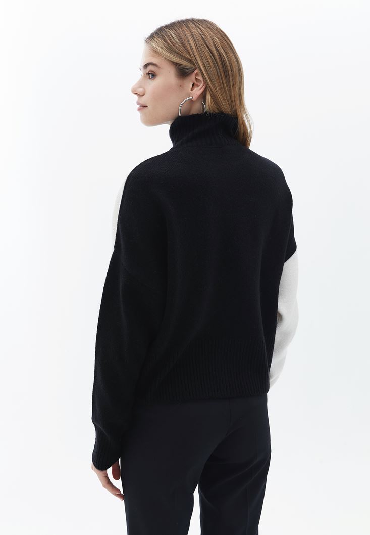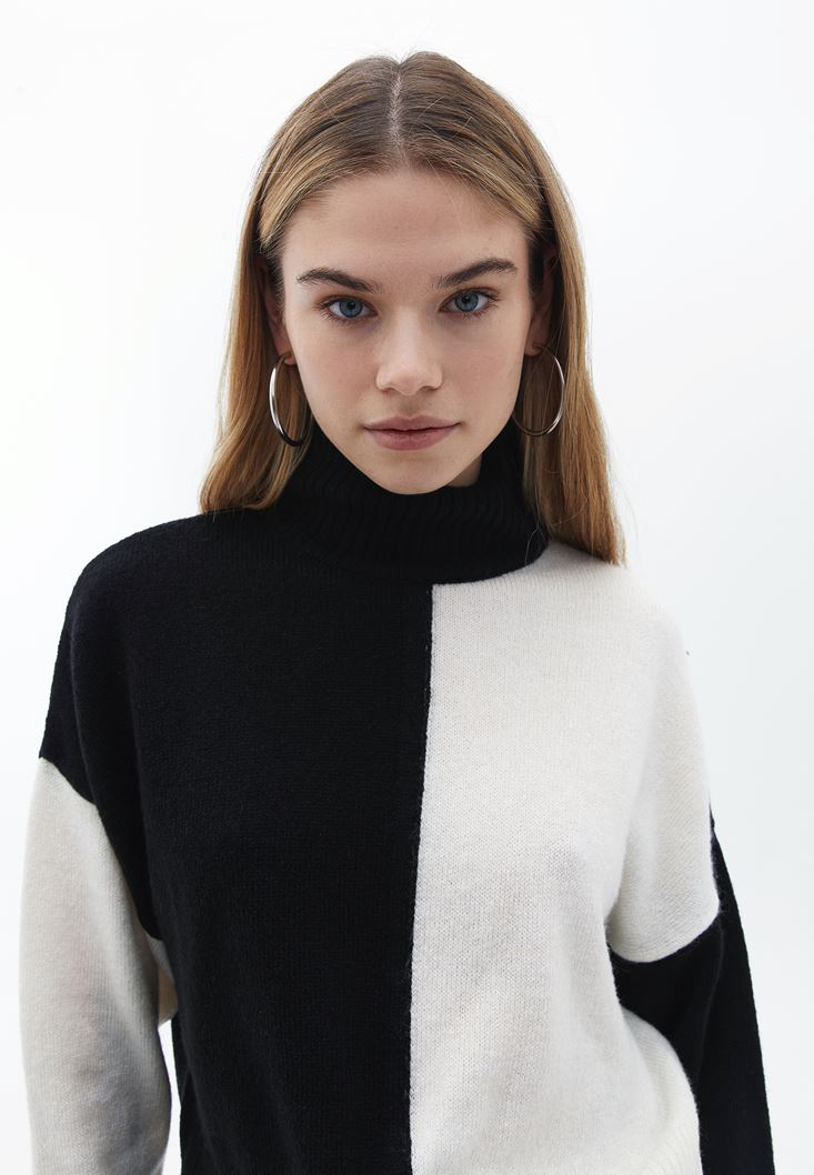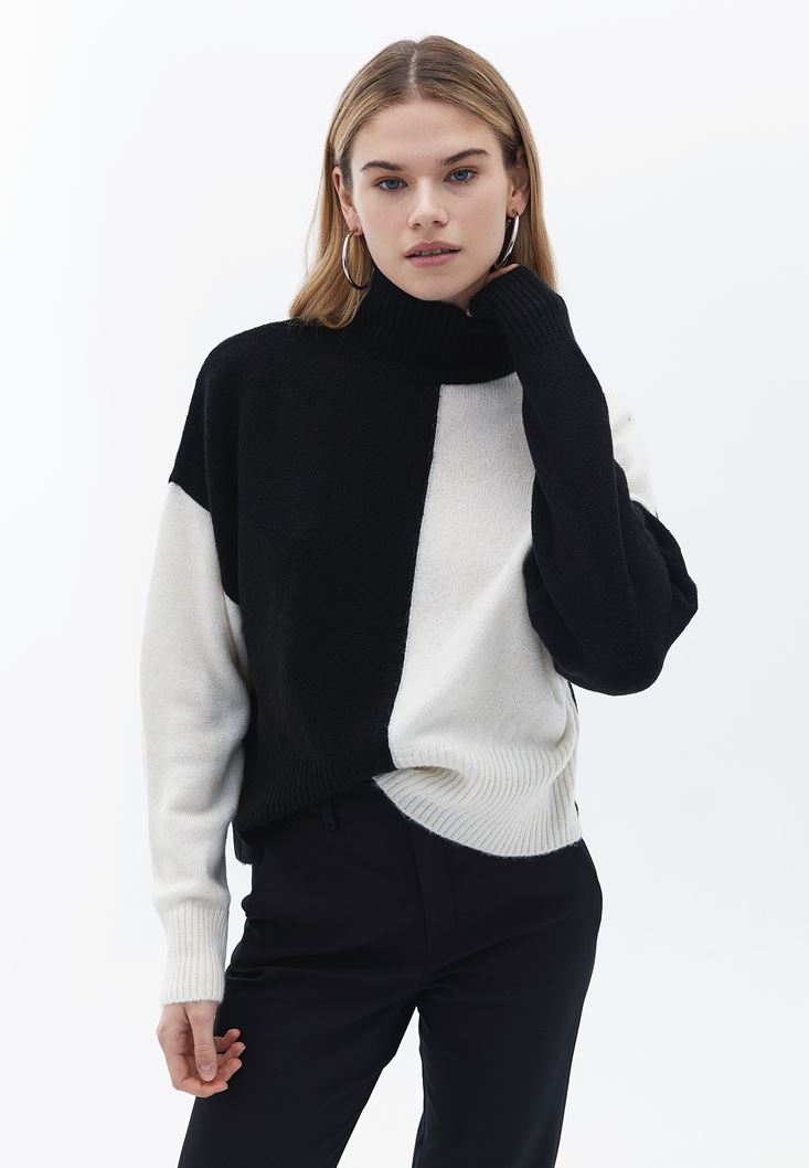 Bedenden uzak rahat fit, yüksek yaka, blok renkli, uzun kollu.