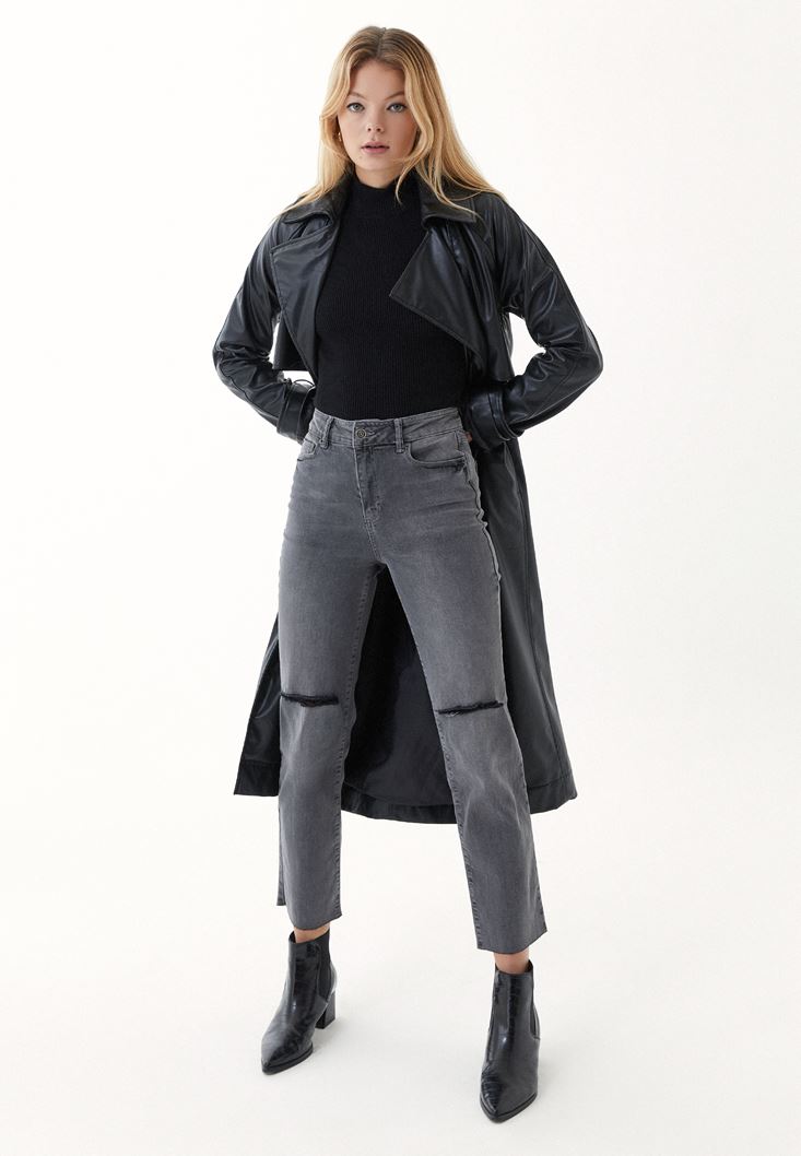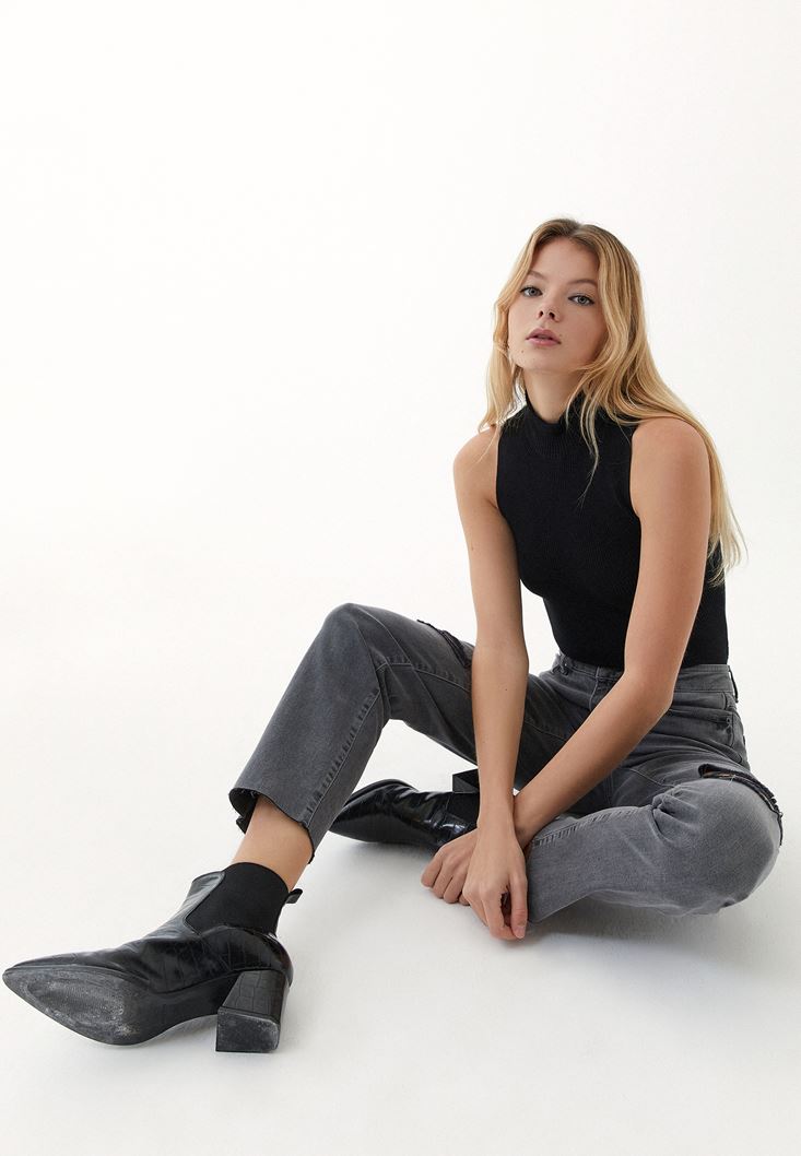 Viskon karışımlı fitilli triko, yüksek yaka, crop kesim, bedeni saran esnek fit.