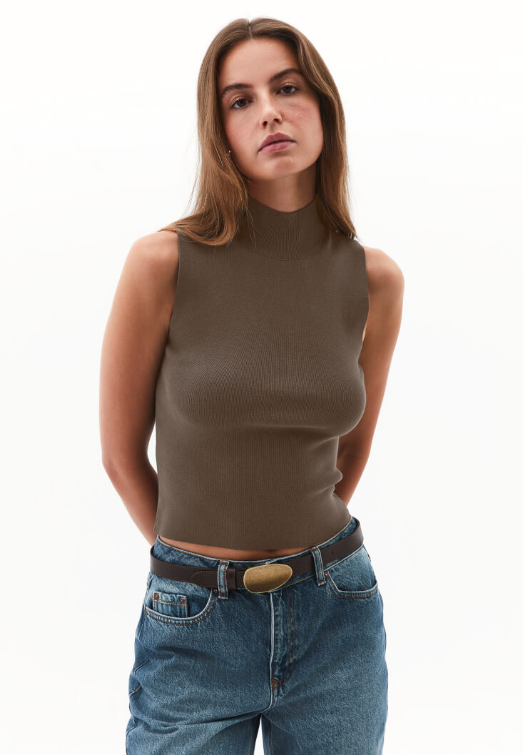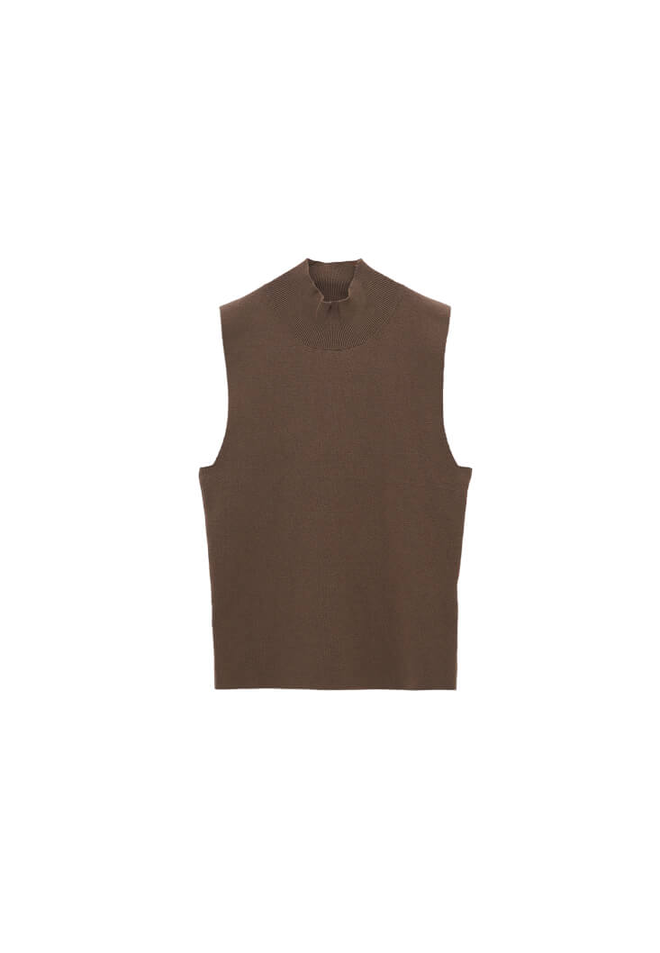 Viskon karışımlı triko, bedeni saran esnek fit, yüksek yaka, kolsuz tasarım, yakası jakarlı örgü.