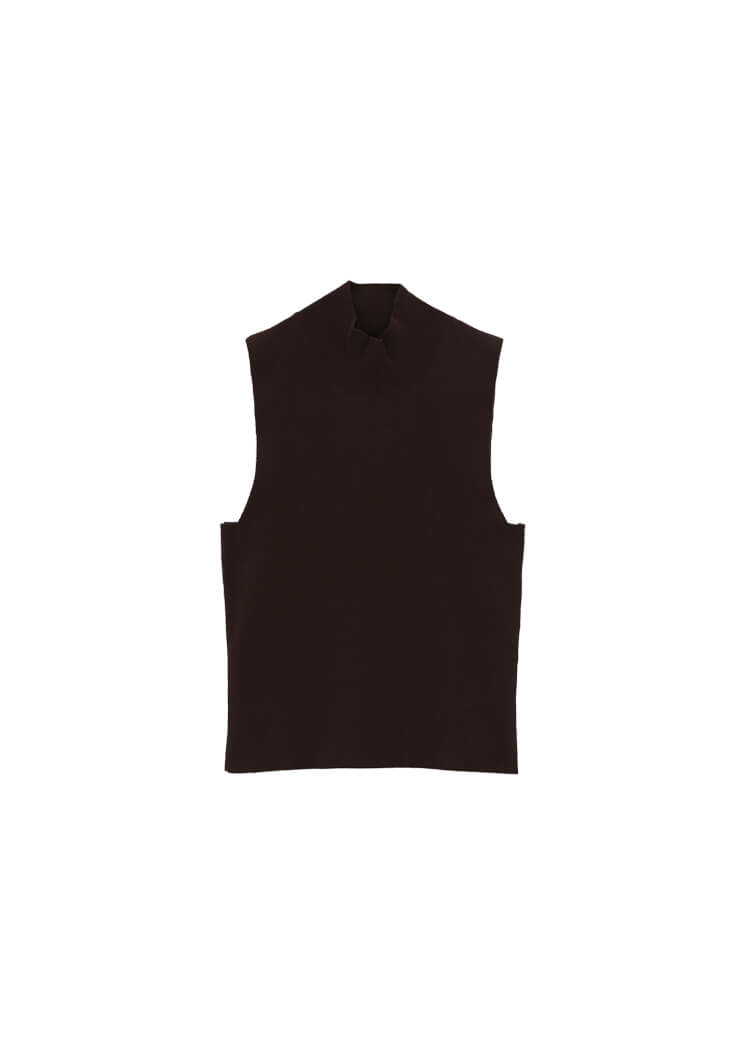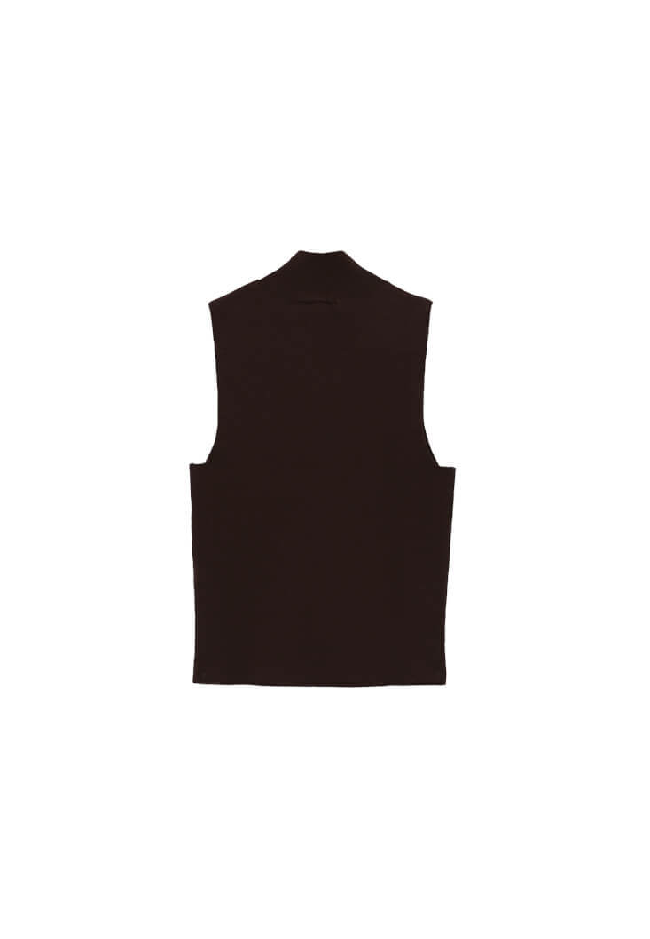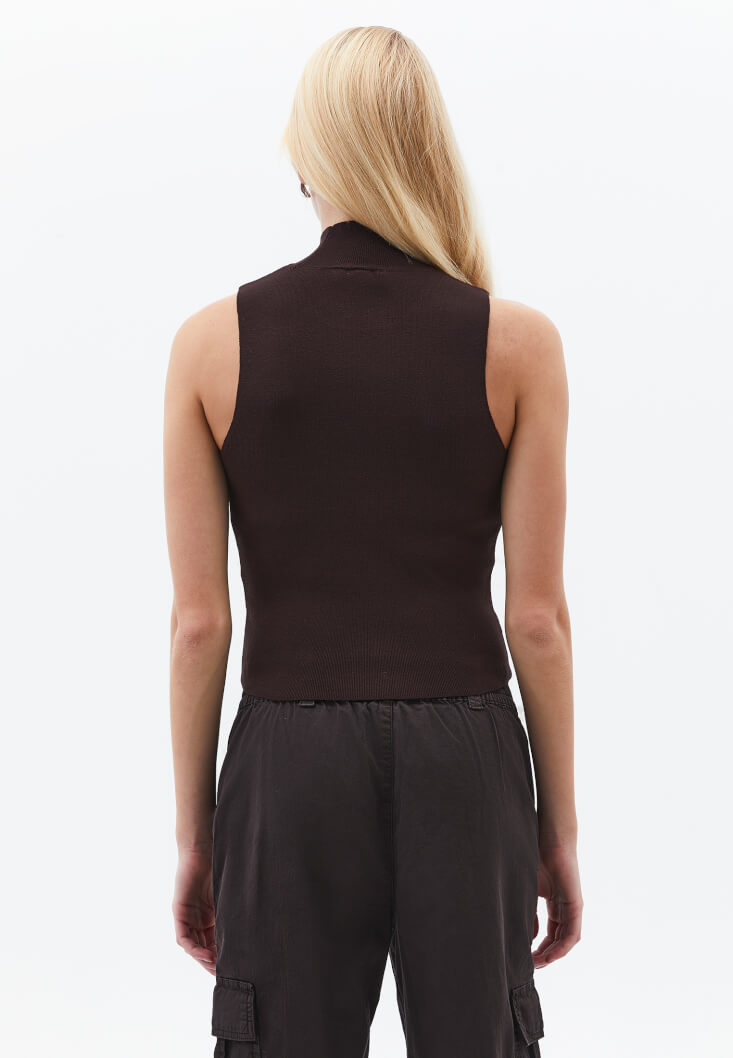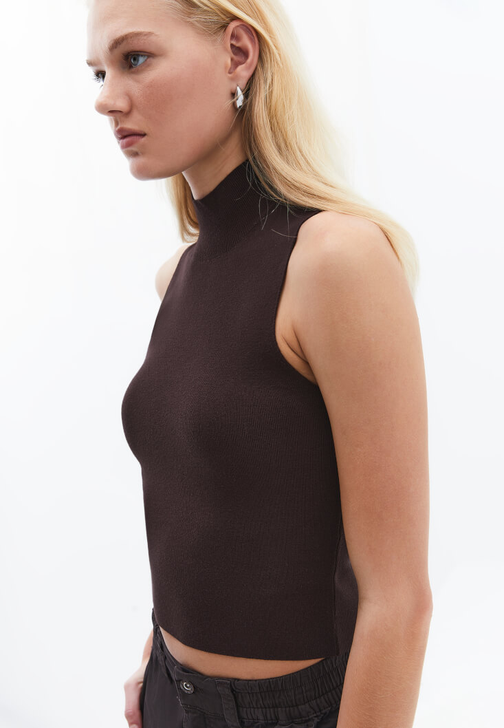 Viskon karışımlı triko, bedeni saran esnek fit, yüksek yaka, kolsuz tasarım, yakası jakarlı örgü.