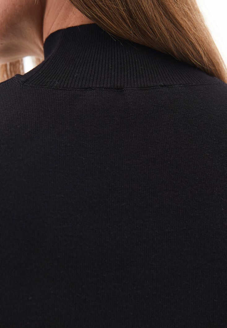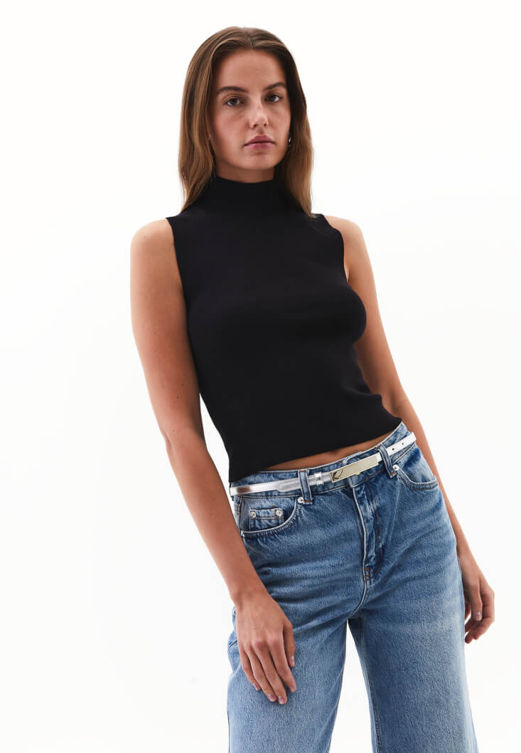 Viskon karışımlı triko, bedeni saran esnek fit, yüksek yaka, kolsuz tasarım, yakası jakarlı örgü.