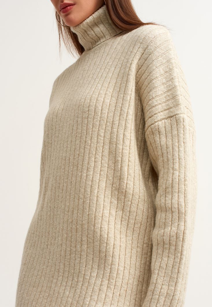Pamuk karışımlı özel triko, fitilli örgü, yüksek yaka, uzun kollu, tunik form, bedenden uzak rahat kalıp, mini boy.