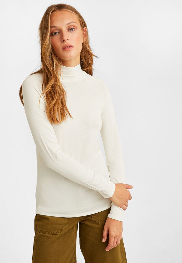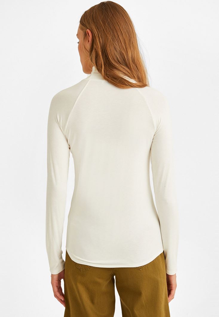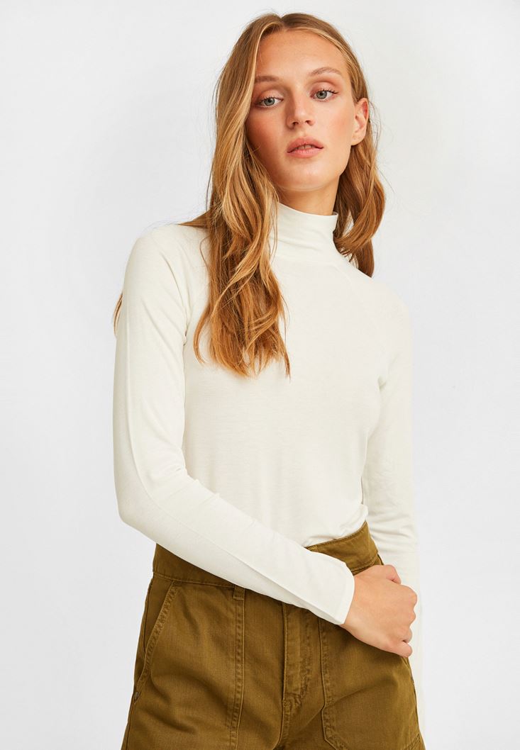 Krem Yüksek Yaka Uzun Kollu Bluz