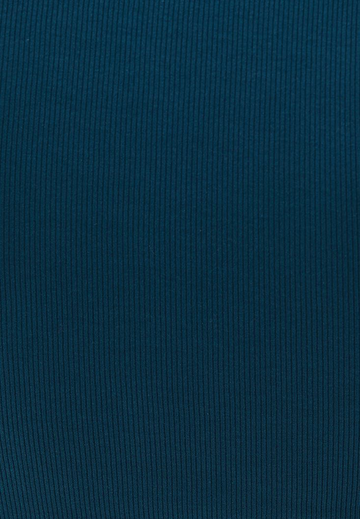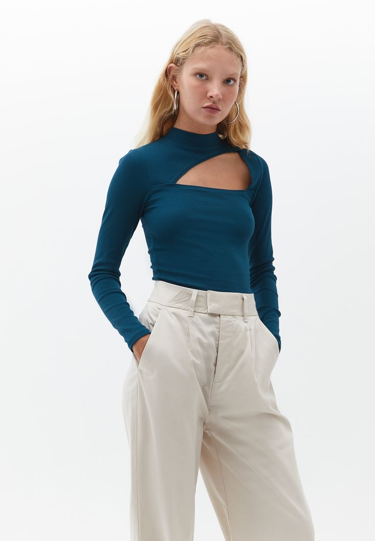 Pamuk içerikli fitilli doku, bedeni saran esnek fit, yüksek yaka, ön kısmı cut out detaylı, uzun kollu, standart boy.