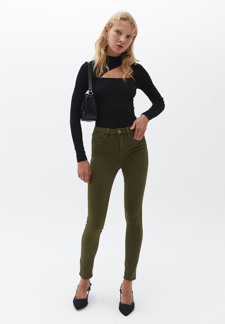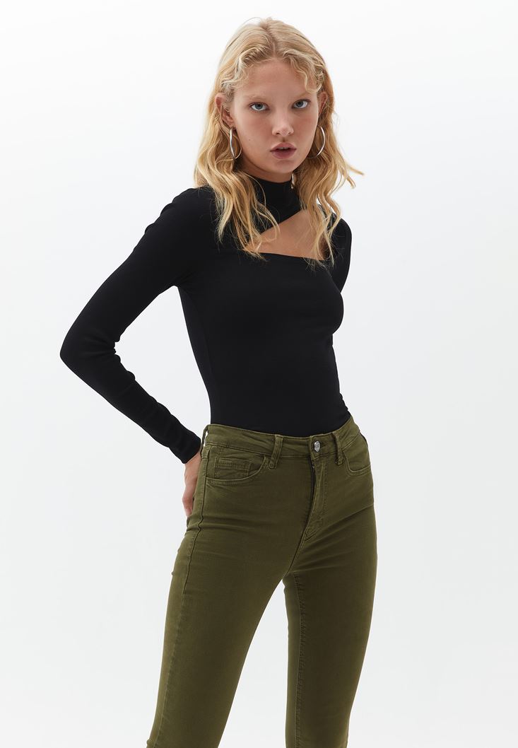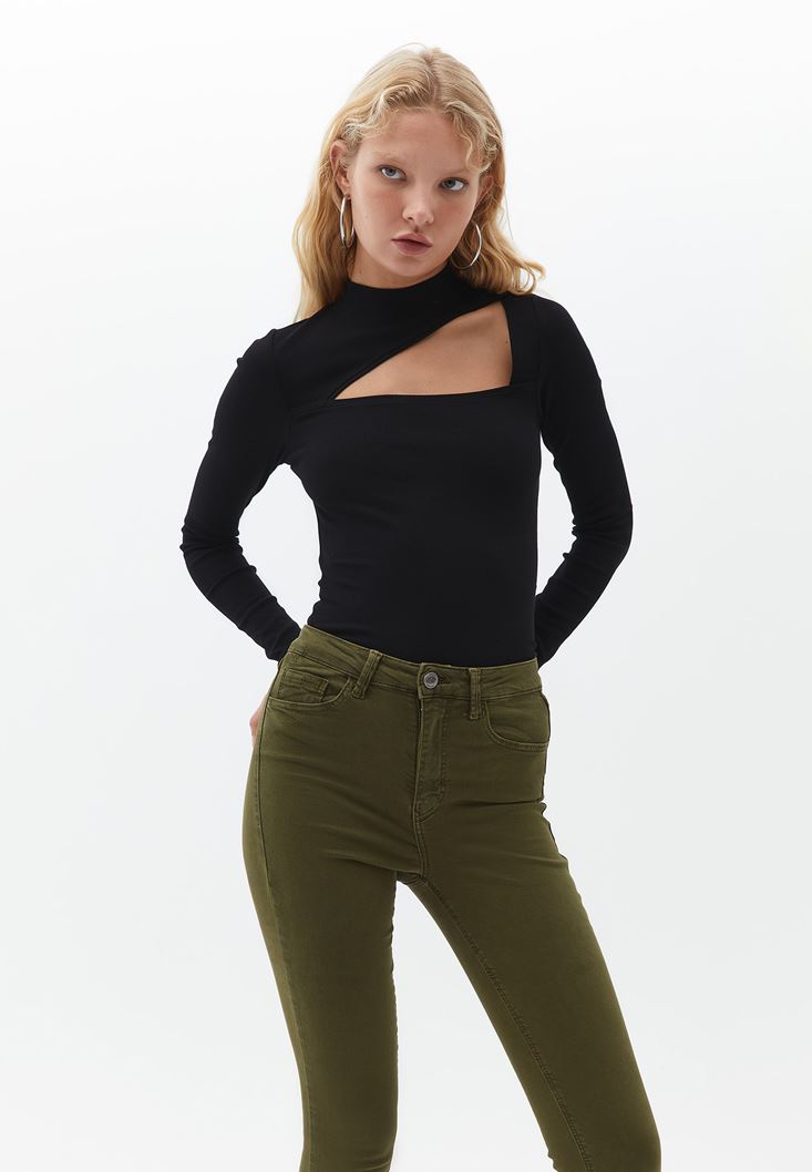 Pamuk içerikli fitilli doku, bedeni saran esnek fit, yüksek yaka, ön kısmı cut out detaylı, uzun kollu, standart boy.