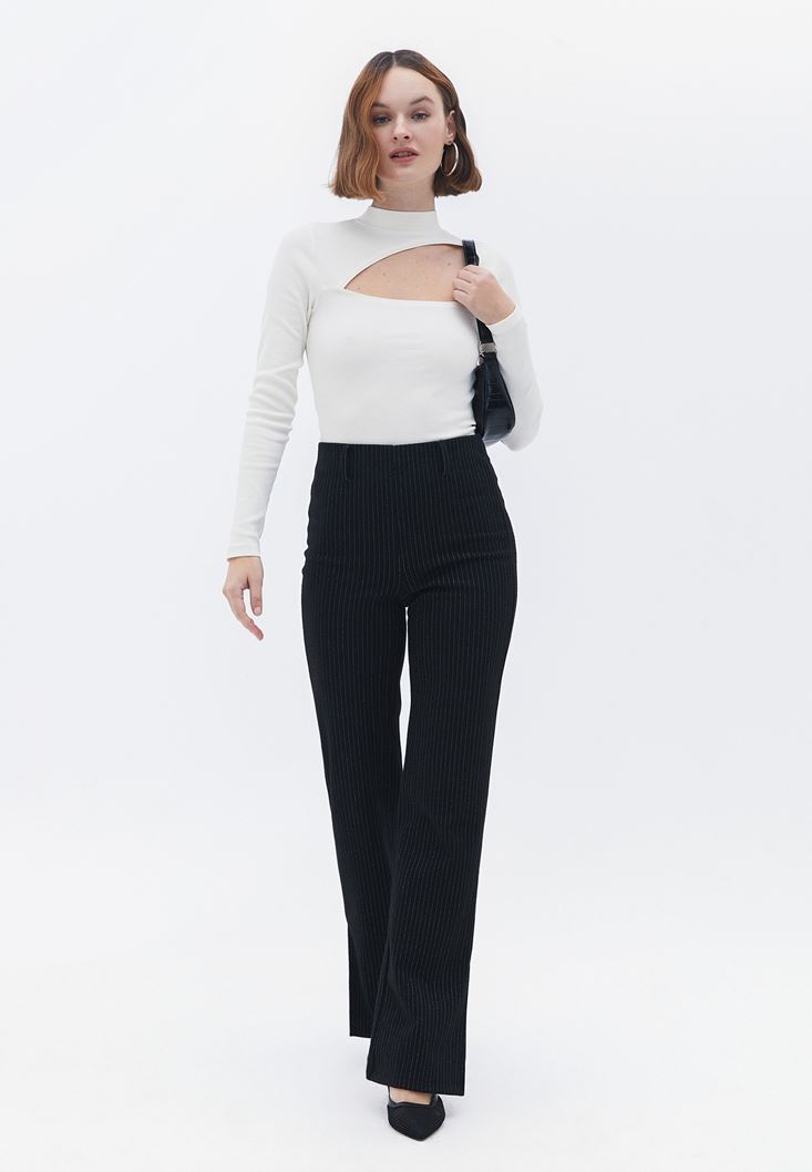 Pamuk içerikli fitilli doku, bedeni saran esnek fit, yüksek yaka, ön kısmı cut out detaylı, uzun kollu, standart boy.