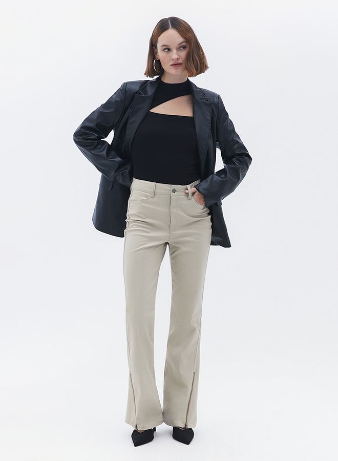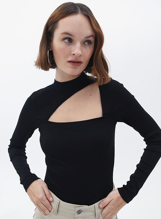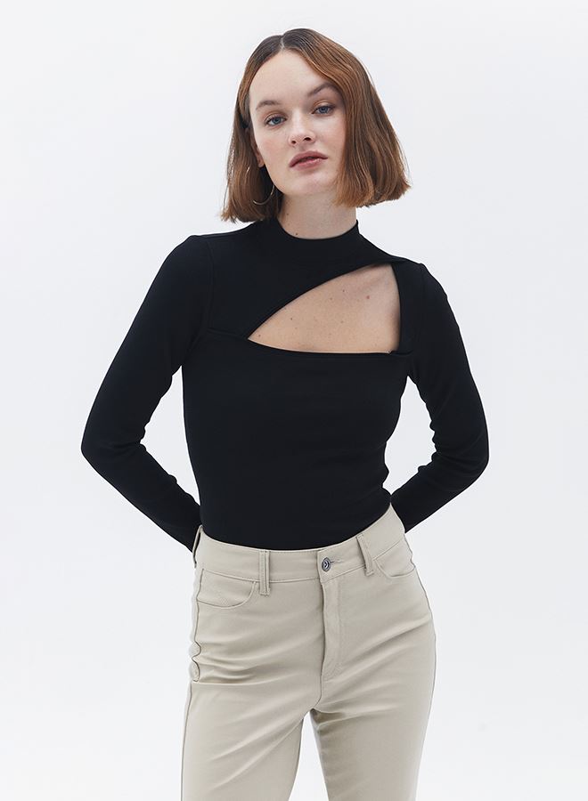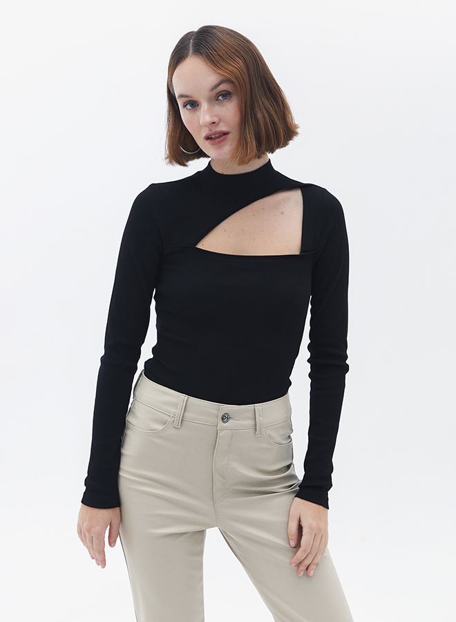 Pamuk içerikli fitilli doku, bedeni saran esnek fit, yüksek yaka, ön kısmı cut out detaylı, uzun kollu, standart boy.