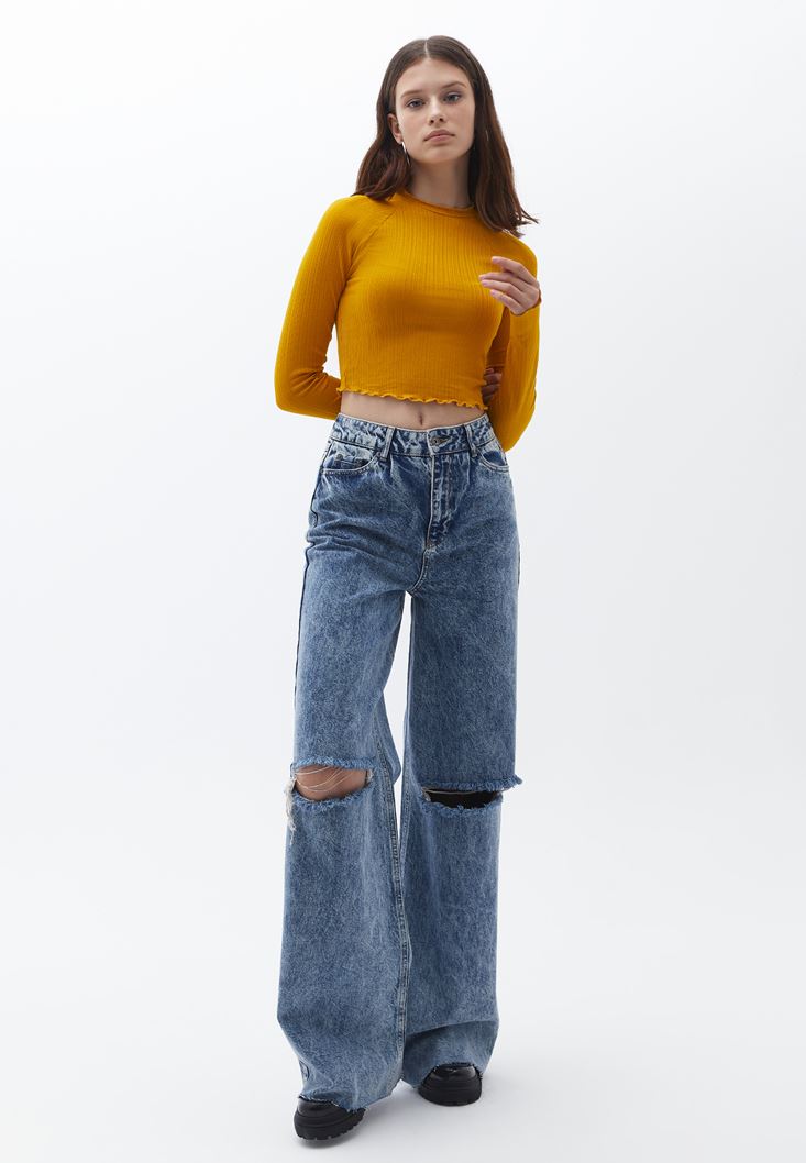• Bayan Sarı Yüksek Yakalı Uzun Kollu Tişört