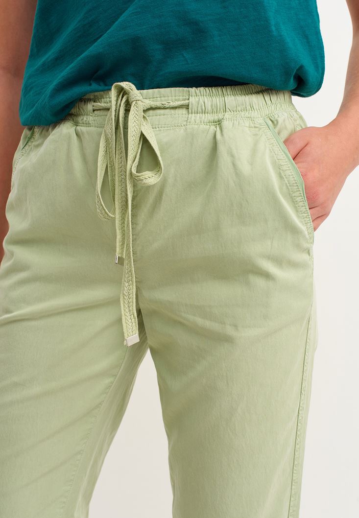 Bağcıklı bel, iki cepli, kıvrılabilen paça formu, geri dönüştürülebilir kumaş dokusu.