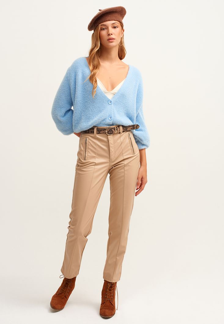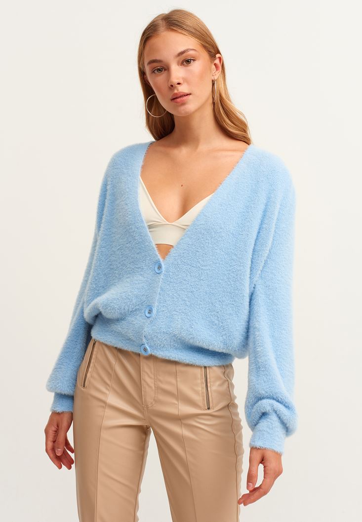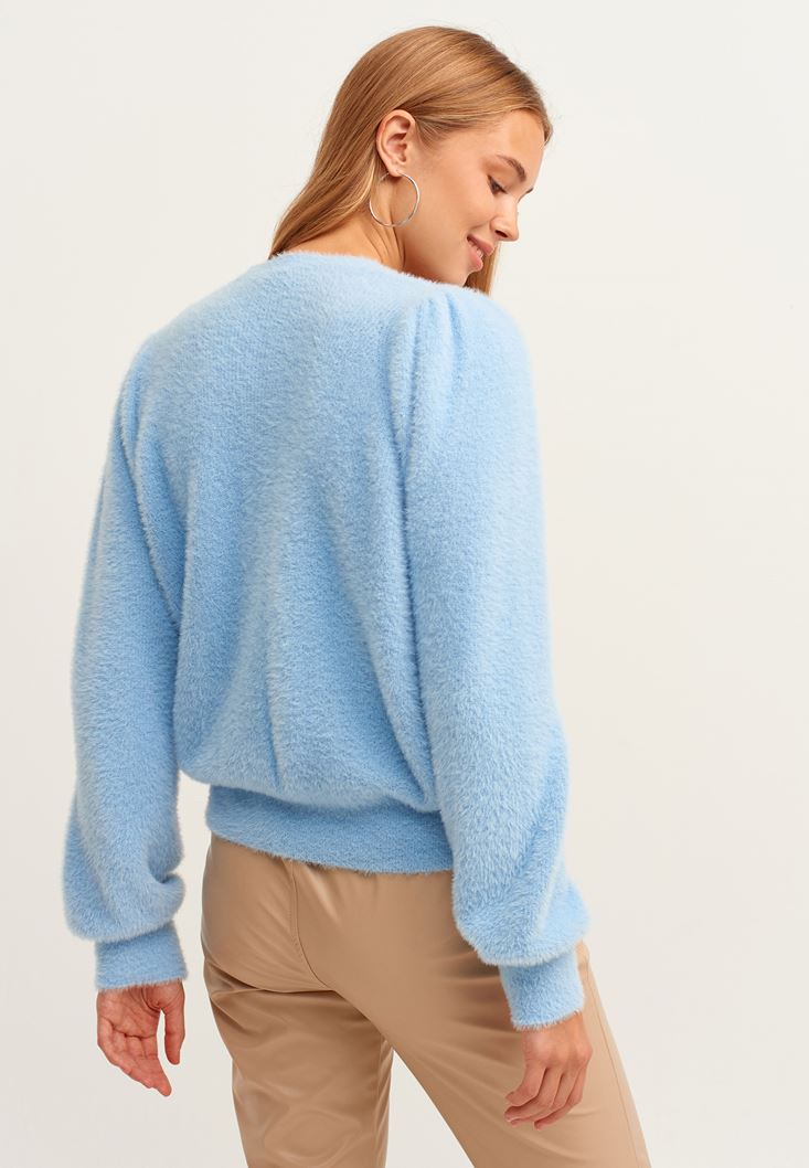 Mavi Yumuşak Dokulu Balon Kollu Hırka