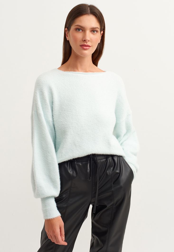 • Bayan Mavi Yumuşak Dokulu Balon Kollu Triko