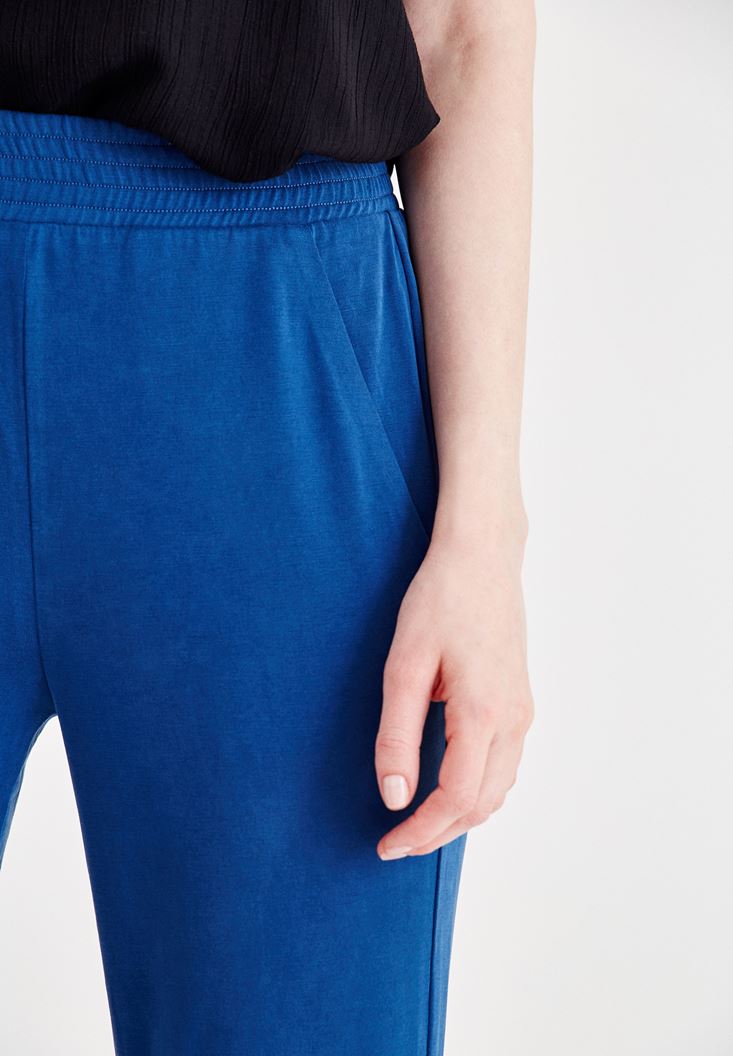 Yumusak Dokulu Büzgü Detayli Pantolon modeli konforu ve sikligi bir araya getiren tasarimi ile dikkat çekiyor. Günlük ve klasik kombinlerinde rahatlikla tercih edebileceginiz pantolon modelleri arasinda yer alan tasarimin lastikli bel kesimi kullanim konforunu ön plana çikariyor. Kisa paça boyu, diz hizasindan baslayan ve paça sonuna kadar devam eden büzgülü paça kesimi ile enerjisi yüksek bir görünüme sahip olan pantolon modelinin sahip oldugu modal doku da konforunuzu ve sikliginizi basarili bir sekilde destekliyor. Modal lifinin yüksek nem transfer etme özelligi ve yumusak dokusu sayesinde her zaman rahatlik ve özgürlük sunan pantolon modeli, OXXO'nun zarafeti ve sadeligi bulusturan tasarimlari arasinda yer aliyor.