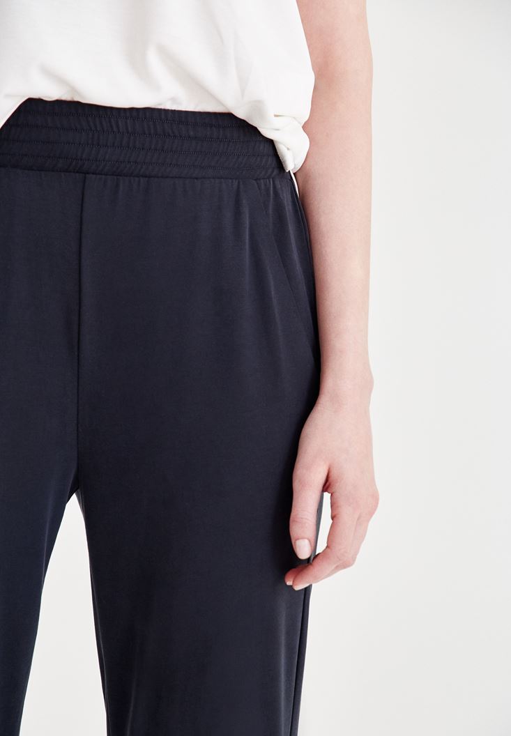 Yumusak Dokulu Büzgü Detayli Pantolon modeli konforu ve sikligi bir araya getiren tasarimi ile dikkat çekiyor. Günlük ve klasik kombinlerinde rahatlikla tercih edebileceginiz pantolon modelleri arasinda yer alan tasarimin lastikli bel kesimi kullanim konforunu ön plana çikariyor. Kisa paça boyu, diz hizasindan baslayan ve paça sonuna kadar devam eden büzgülü paça kesimi ile enerjisi yüksek bir görünüme sahip olan pantolon modelinin sahip oldugu modal doku da konforunuzu ve sikliginizi basarili bir sekilde destekliyor. Modal lifinin yüksek nem transfer etme özelligi ve yumusak dokusu sayesinde her zaman rahatlik ve özgürlük sunan pantolon modeli, OXXO'nun zarafeti ve sadeligi bulusturan tasarimlari arasinda yer aliyor.