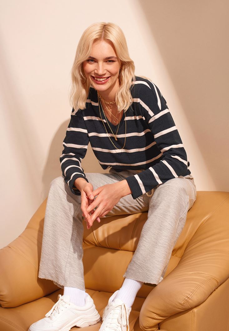 Çok Renkli Yumuşak Dokulu Çizgili Triko modeli hem rahat kesimi hem de sadelikten gelen şıklığı yansıtan detayları ile severek kullanacağınız parçalardan birisi olacak. V yaka kesime sahip olan kadın triko modelinde yakanın ön plana çıkması için kullanılan biye detay aynı zamanda tasarımın duruşunu da güçlendiriyor. Yatay çizgili tasarımı ile oldukça modern ve spor bir görünüme sahip olan kadın triko modeli ile şıklığınızı konfor ile buluşturmanın tadını çıkaracaksınız. Sahip olduğu dökümlü kesimi çizgi detayları ile daha da ön plana çıkaran triko modelinin farklı alt giyim parçaları ile birlikte kombinleyebilirsiniz. OXXO’nun özgün ruhunu yansıtan, basic tasarımı ile kurtartıcı parçalar arasında yer alacak çizgili triko modeli ile şıklığınızı en güzel şekilde tamamlayabilirsiniz.