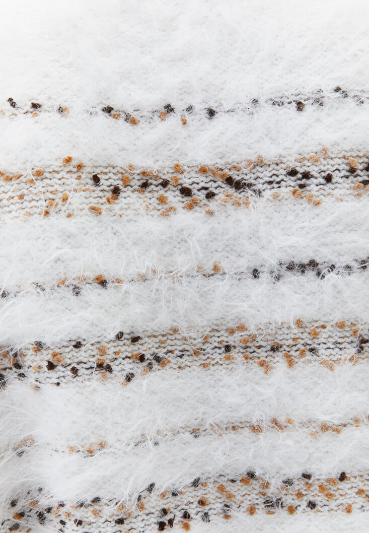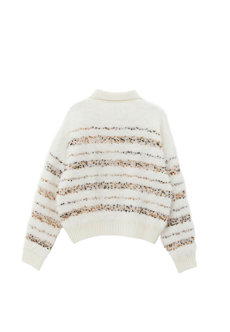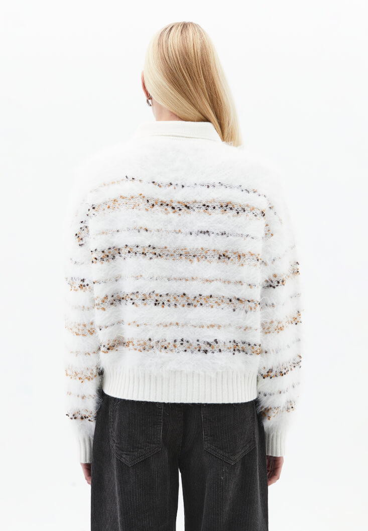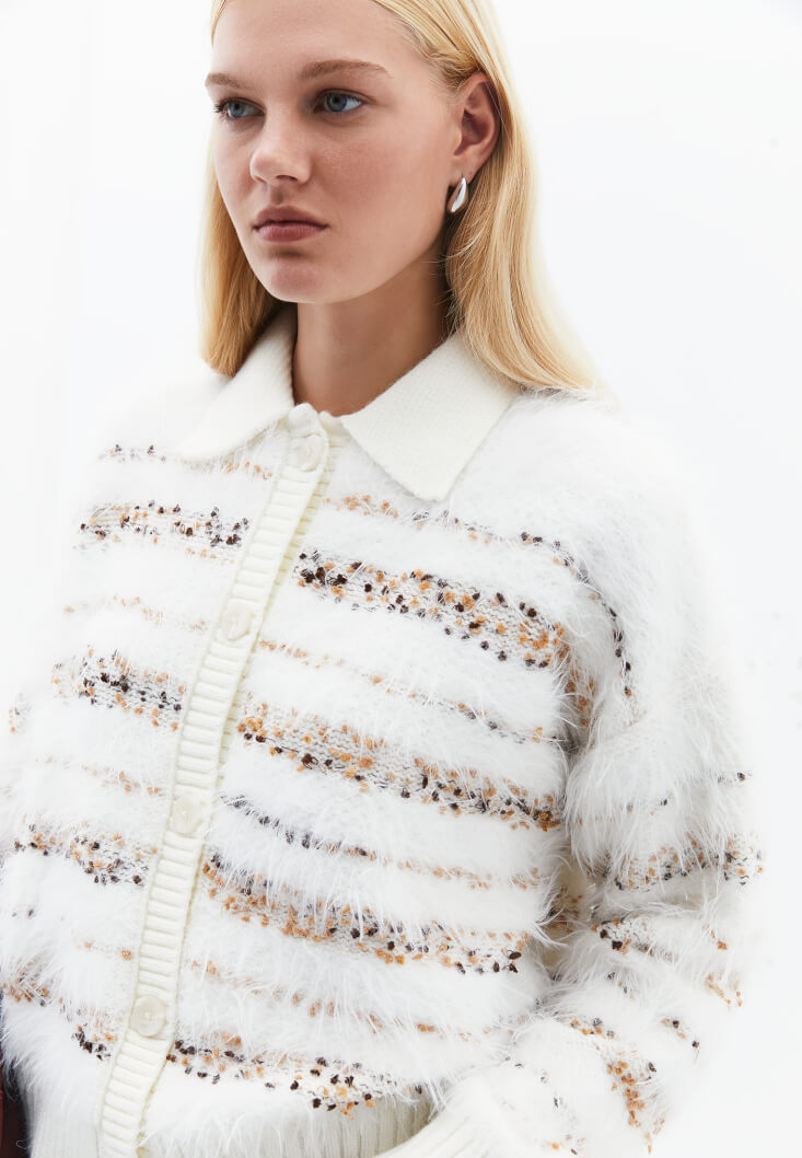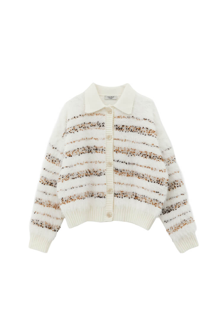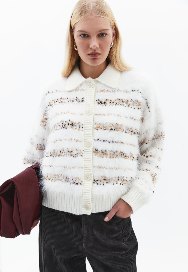 Sakallı triko doku, çizgi desenli renkli örgü, sıfır yaka, uzun kollu, düğme kapamalı, bedene yakın rahat fit.