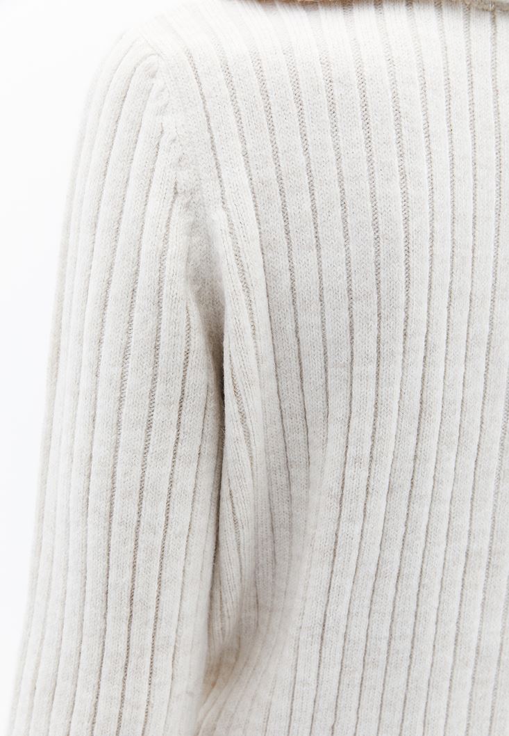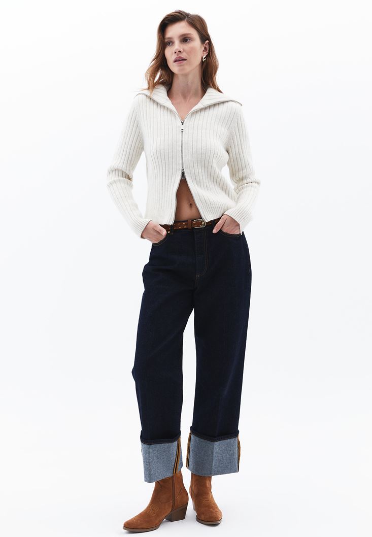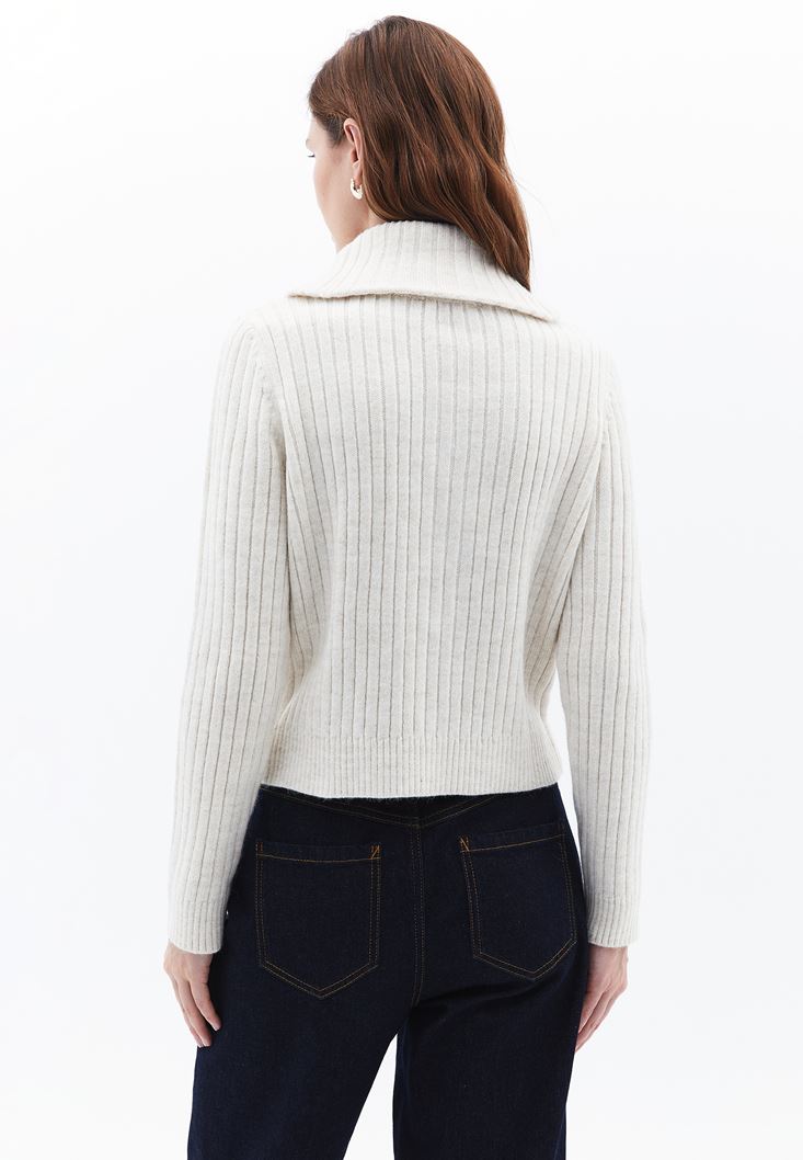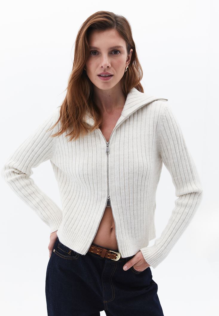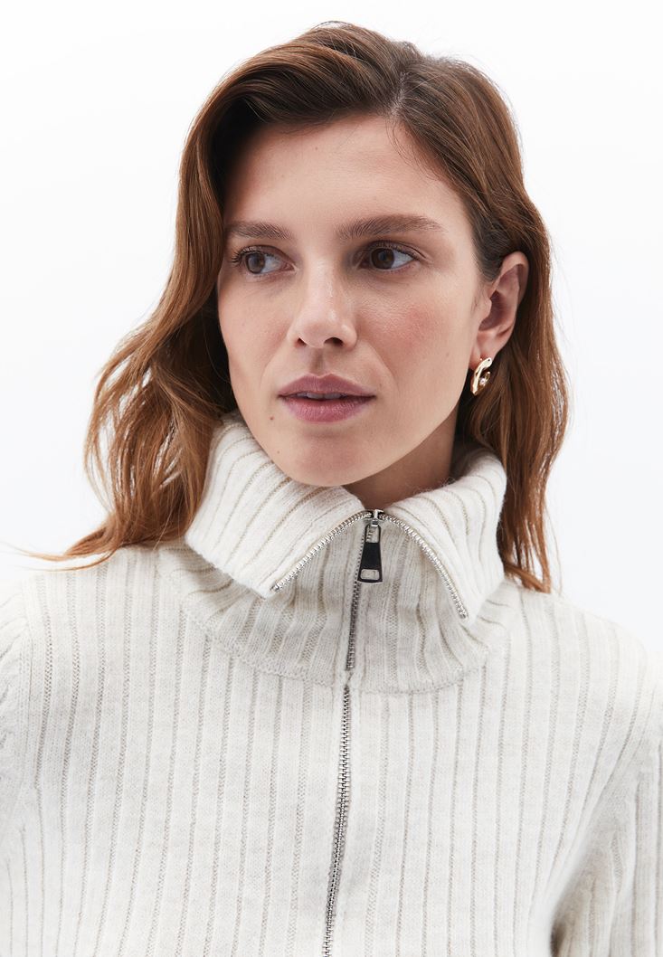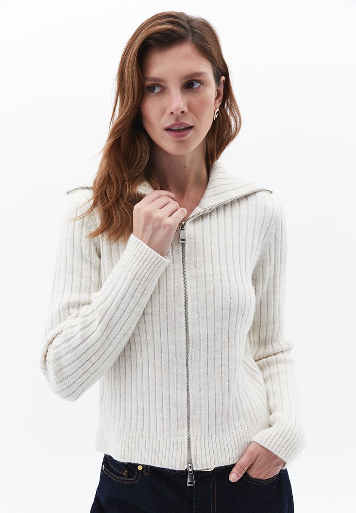 Krem Yumuşak Dokulu Fermuarlı Hırka