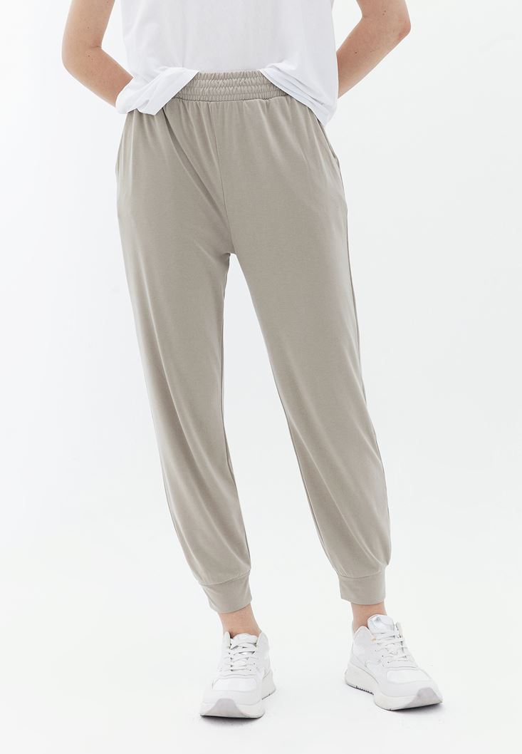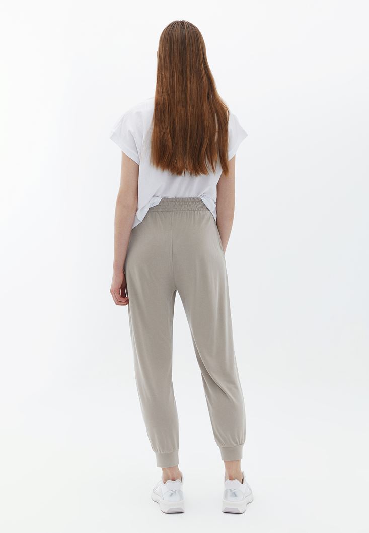 Modal karışımlı özel soft touch doku, yüksek bel, jogger fit, beli ve paçası lastikli, ön kısmı iki cepli.