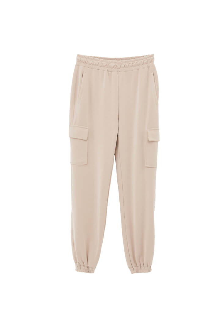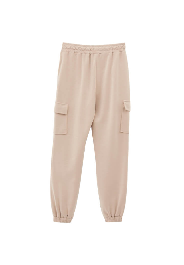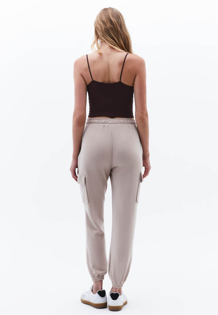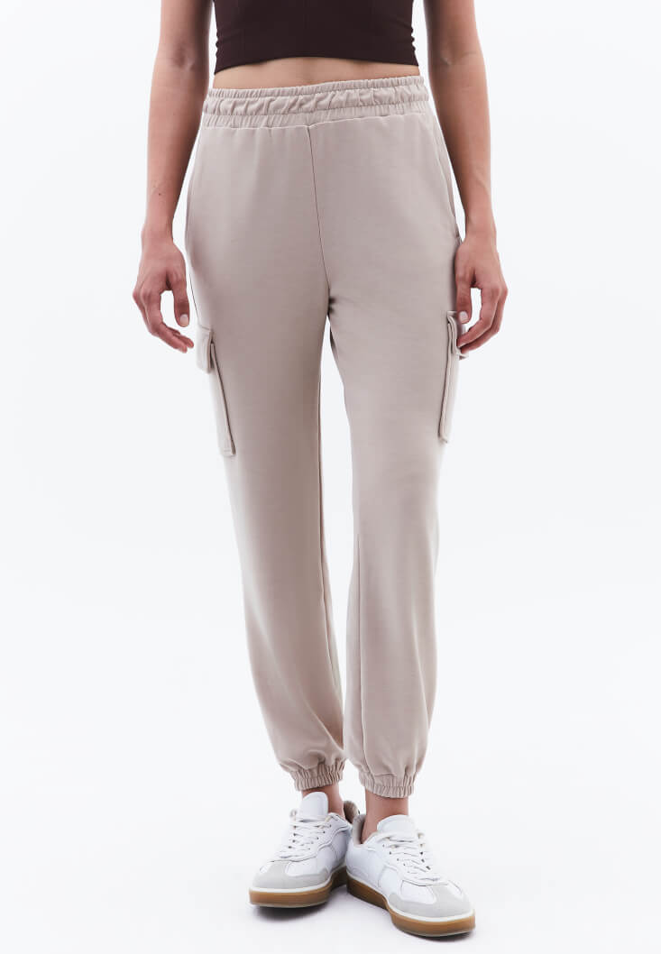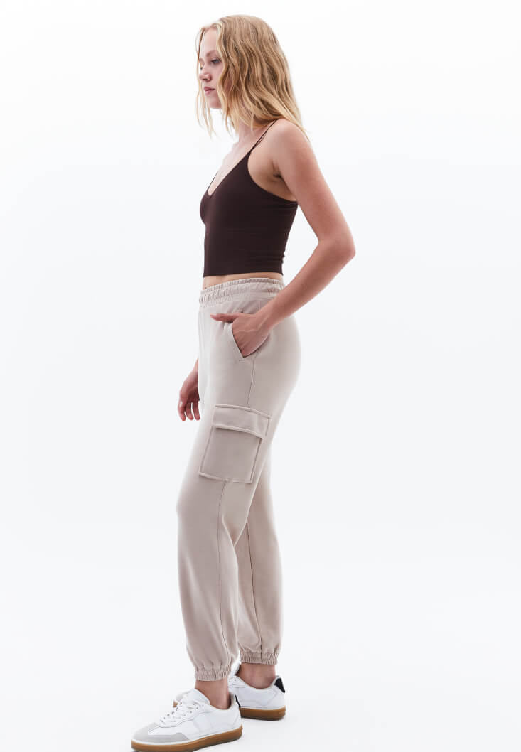 Modal karışımlı özel Soft Touch doku, yüksek bel, bedenden uzak jogger fit, paçası ve beli lastikli, üst kısmı iki cepli ve kargo cep detaylı.