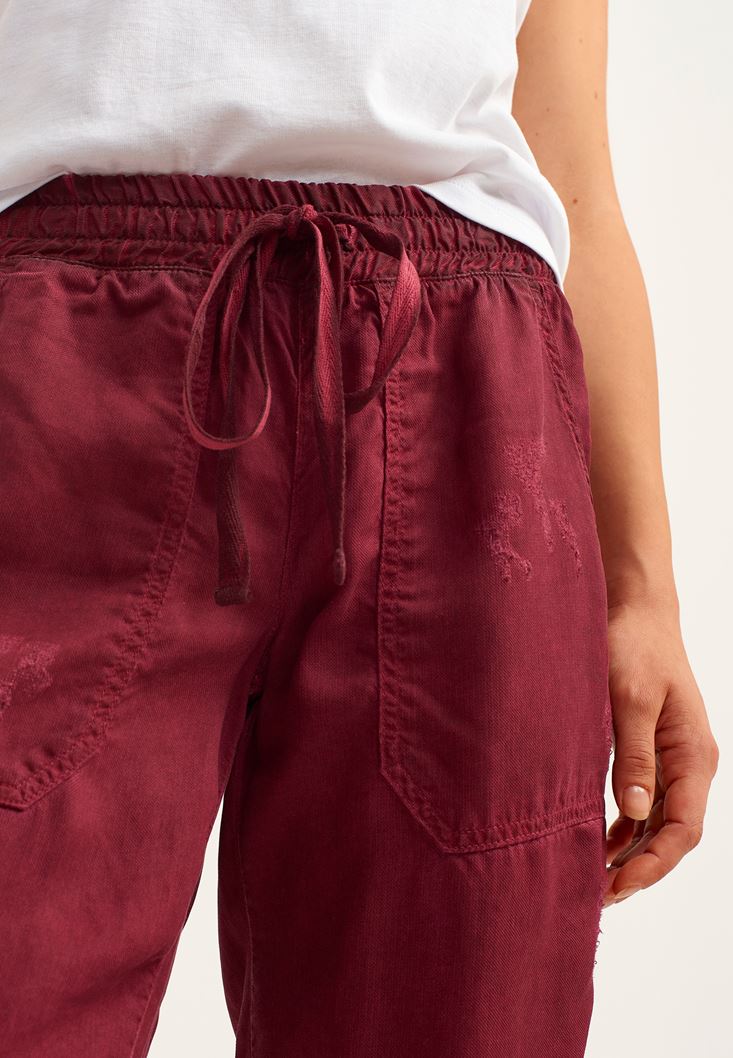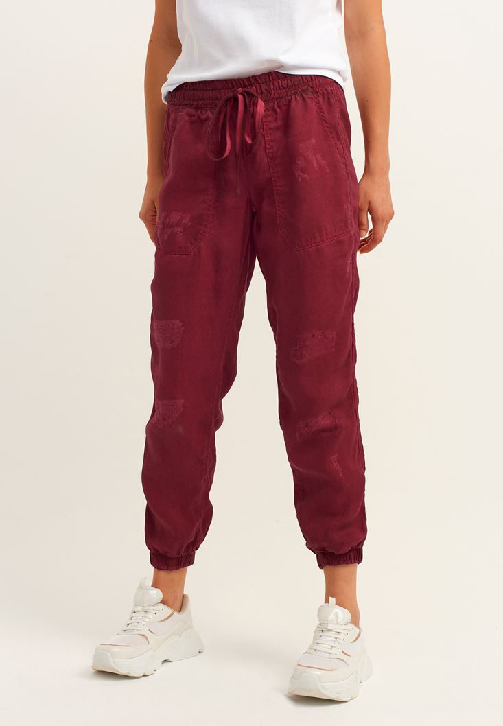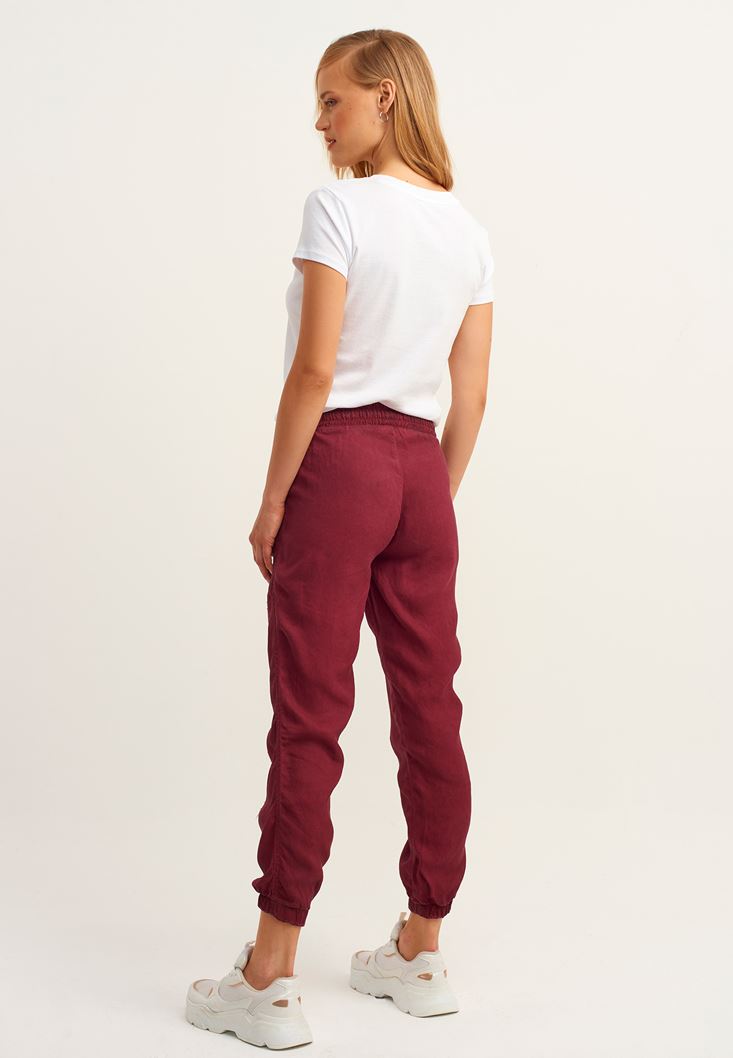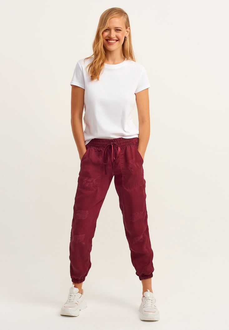 %100 Tencel(Lyocell) geri dönüştürülebilir içerik, orta bel, paçası ve beli lastikli, bel kısmında bağcık detayı, iki cepli, kumaş yüzeyi doku efektli.
