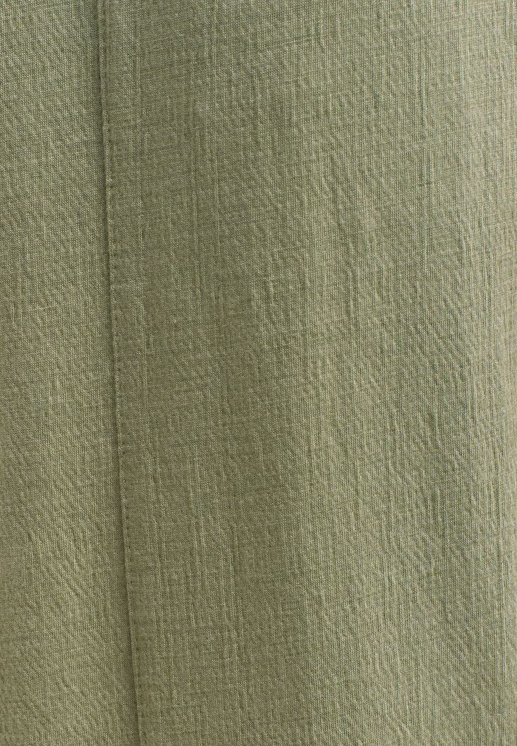 Viskon karışımlı özel doku, yüksek bel, beli ve paçası lastikli, jogger-fit, ön kısmı iki cepli.