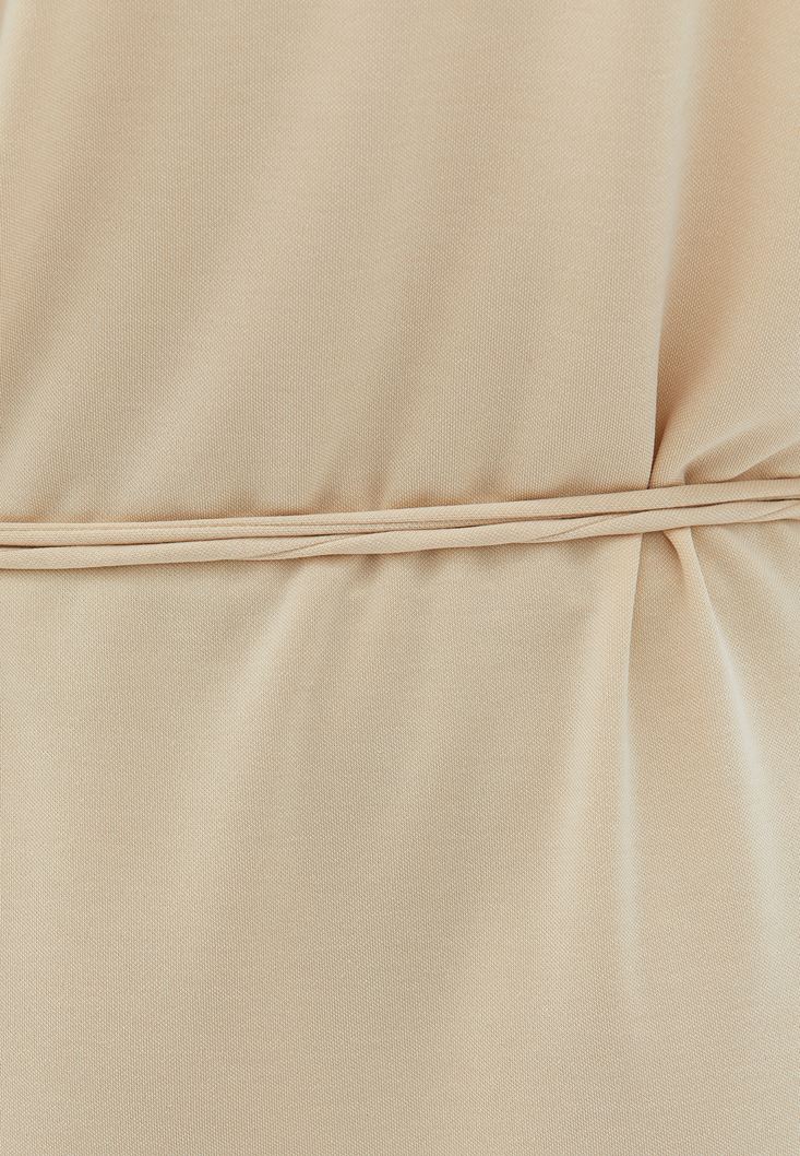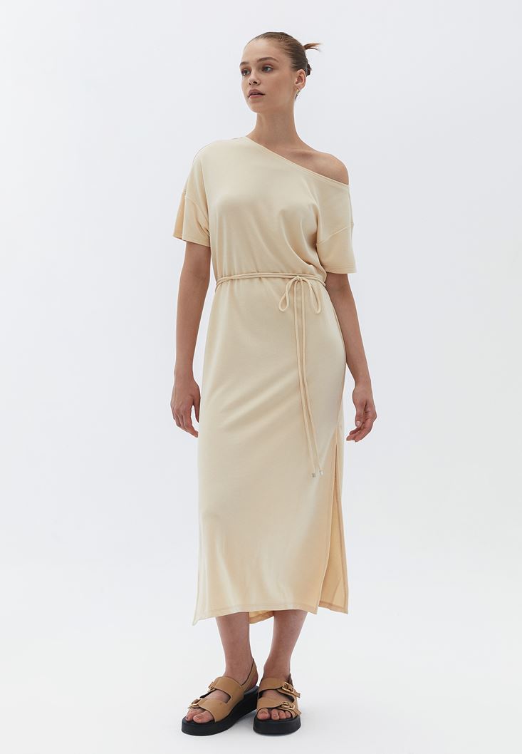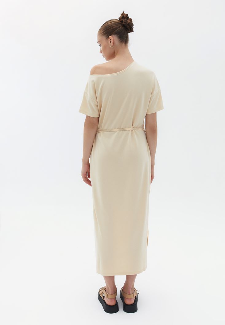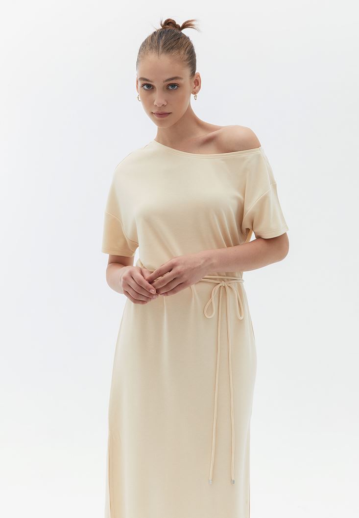 Modal karışımlı özel yumuşak doku, bedenden uzak loose fit, kısa kollu, kayık yaka, midi boy, beli ip bağcıklı.