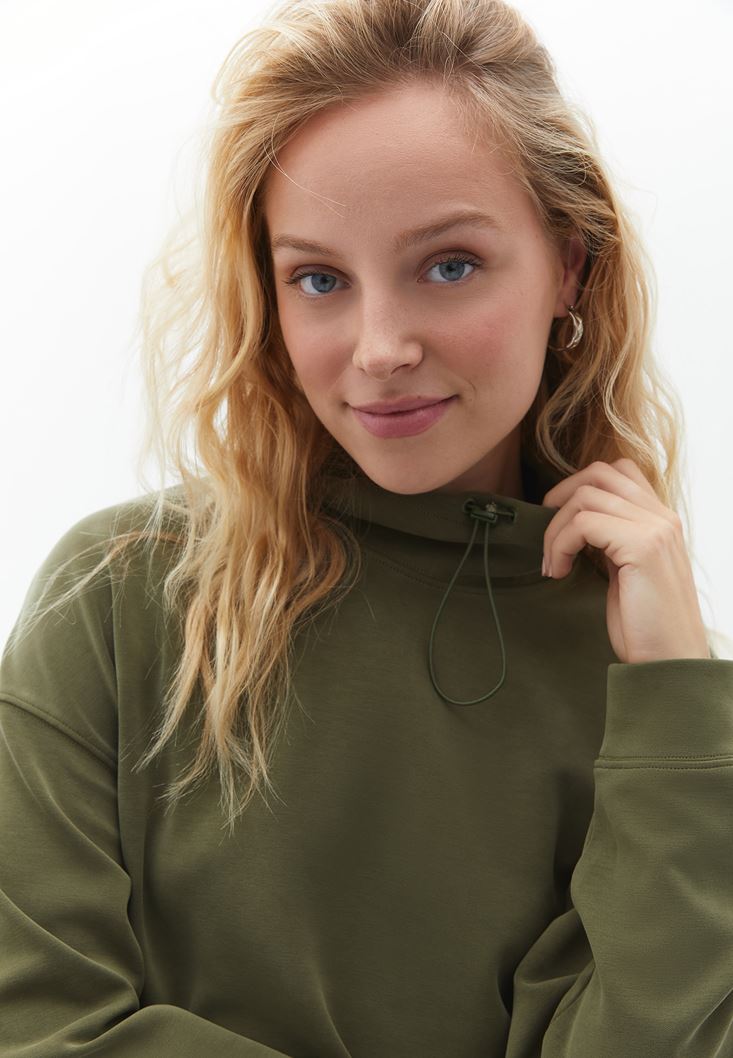 Modal karışımlı yumuşak doku, yüksek yaka, bedene yakın rahat fit, uzun kollu, yakası ayarlanabilir lastikli.