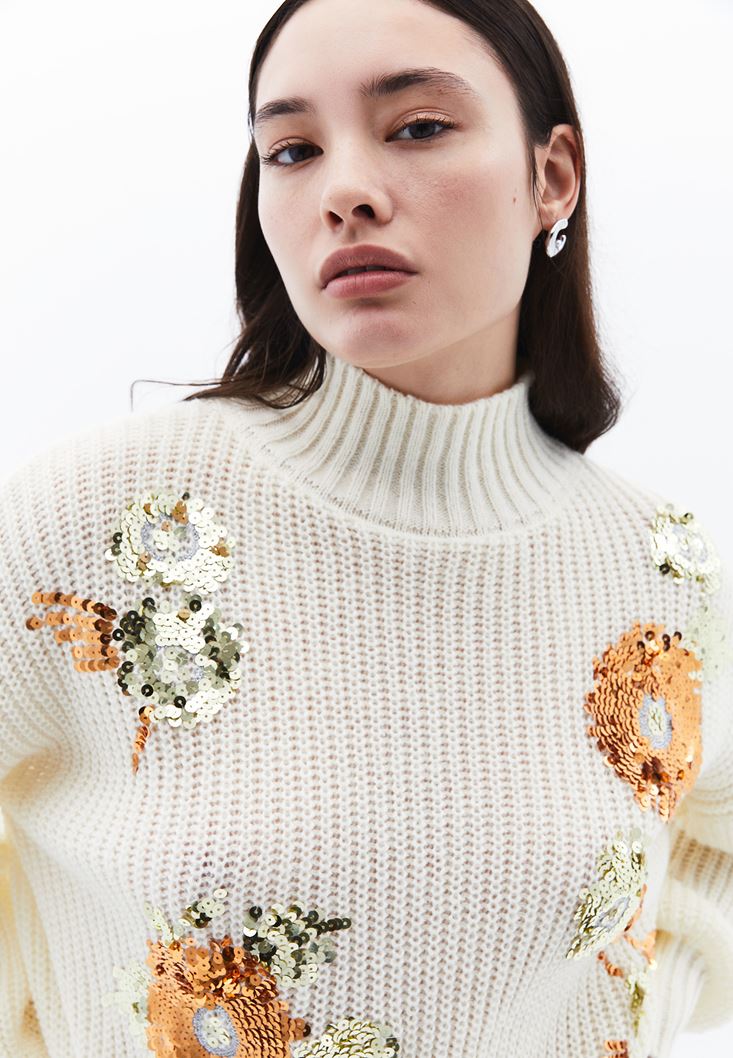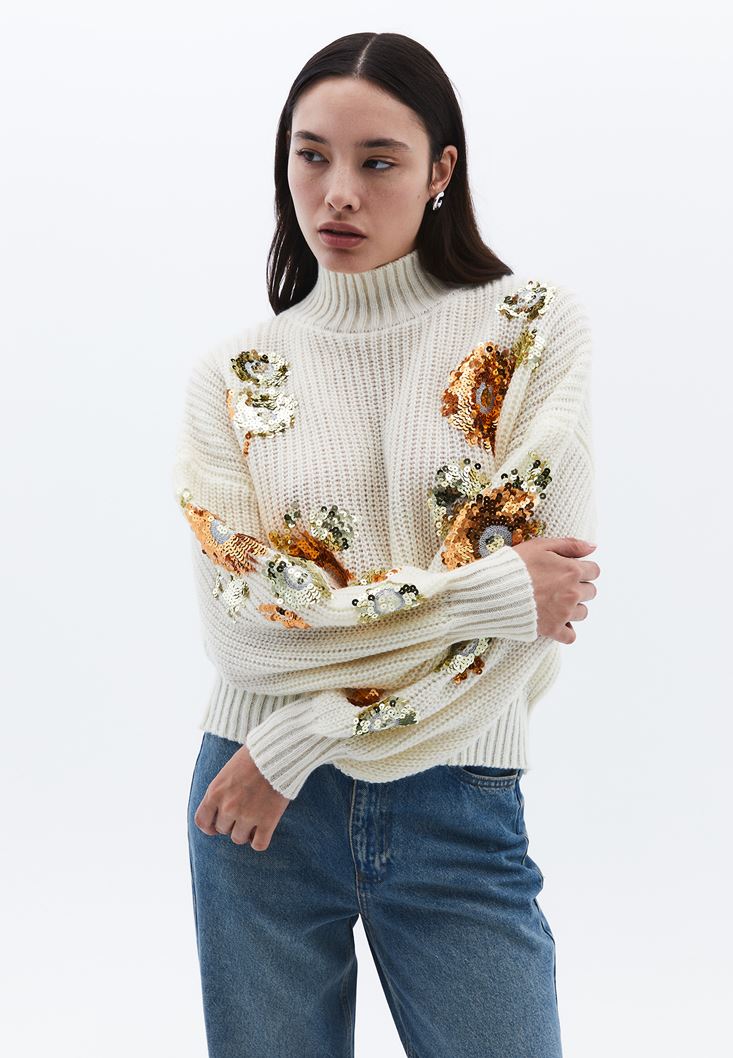 • Bayan Krem Yumuşak Dokulu Payetli Kazak