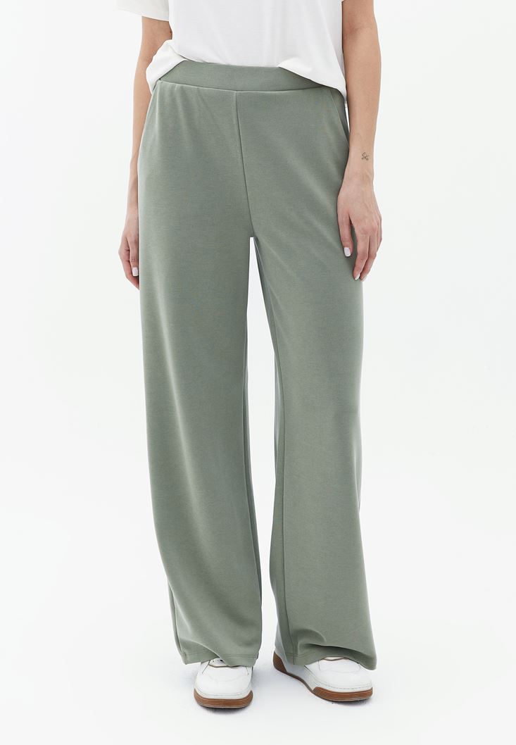 Modal karışımlı yumuşak doku, yüksek bel, bedenden uzak straight fit, düz paça, önü iki cepli, beli lastikli.