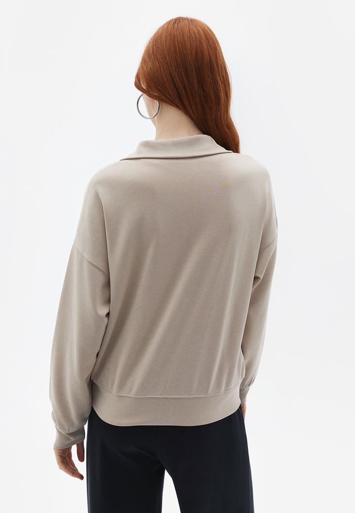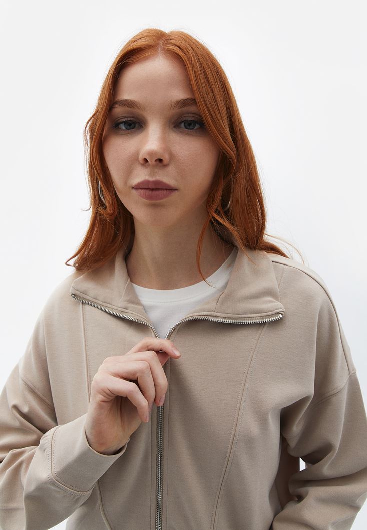 Modal karışımlı yumuşak doku, bedenden uzak rahat fit, uzun kollu, fermuar kapamalı, yüksek yaka, ön beden boyu dikiş detaylı.
