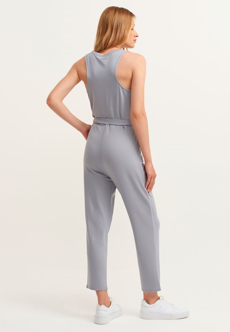Gri Yumuşak Dokulu V-Neck Tulum
