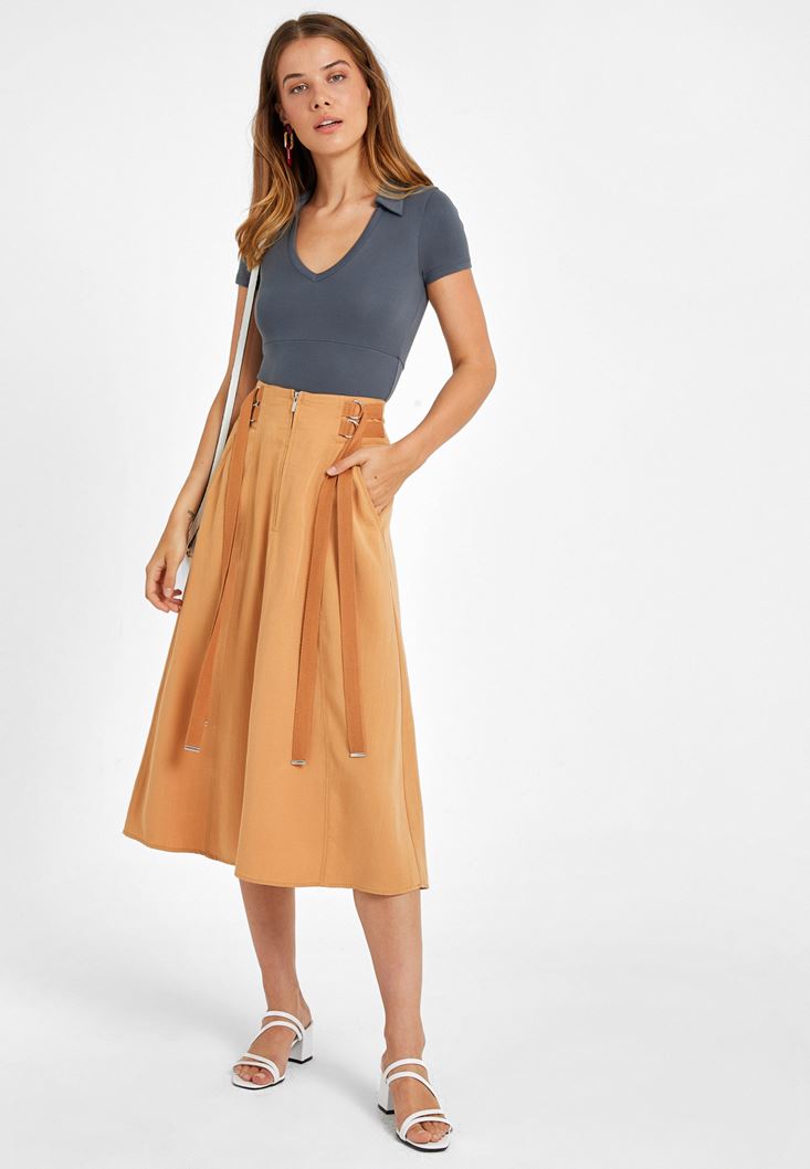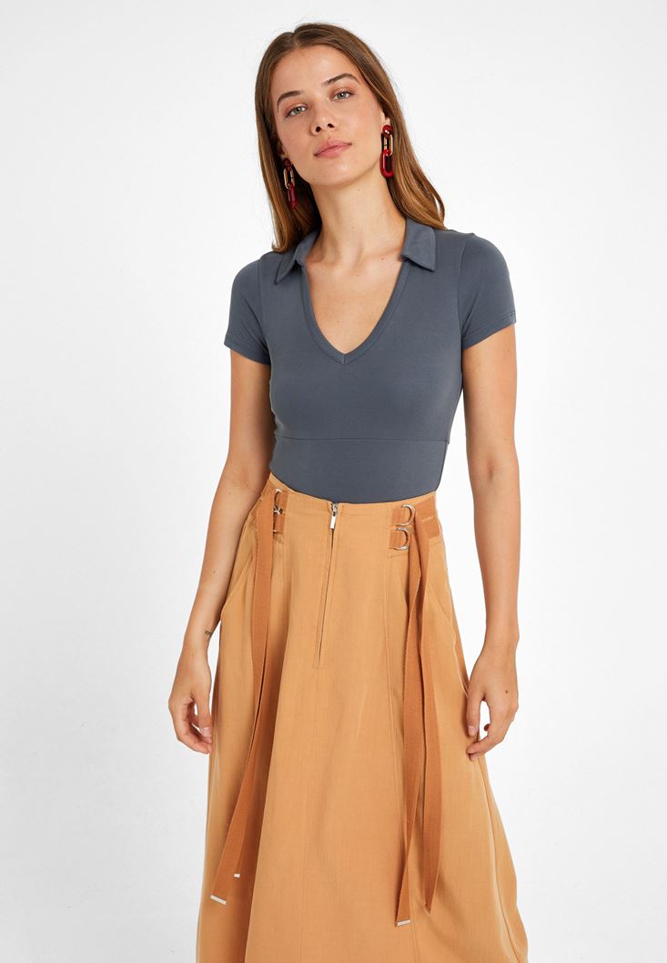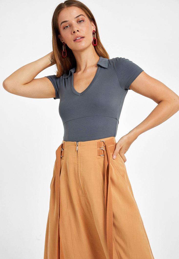 Yumuşak Dokulu V Yaka Kısa Tişört modeli sahip olduğu modern hatları ve spor görünümü ile kısa sürede kombinlerinizin vazgeçilmez parçalarından birisi olacak kadın tişört modelleri arasında yer alıyor. Derin V yaka kesimi ve yakayı ön plana çıkaran biye detayları ile oldukça etkileyici bir görünüme sahip olan V yaka tişört modelinin ense kısmında kullanılan gömlek yakası formu da tasarıma hoş bir enerji kazandırıyor. Yumuşak dokulu tişört modelinin dokusunda yer alan modal lifi bu parçanın yüksek kullanım konforu sunmasına ve hareket özgürlüğünü ön plana çıkarmasında yardımcı oluyor. Kısa bel kesimi sayesinde yüksek ya da düşük bel pantolon modelleri ile kombinlenebilen bu parça, OXXO’nun enerjisini başarılı bir şekilde yansıtıyor.
