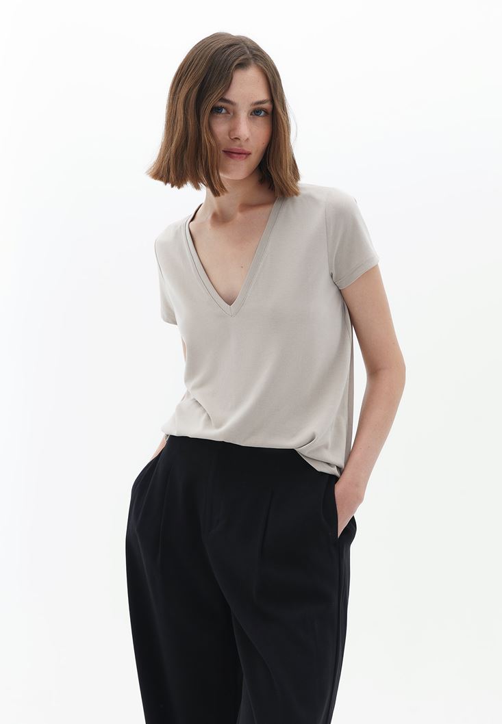 • Bayan Bej Yumuşak Dokulu V Yaka Tişört ( MODAL )