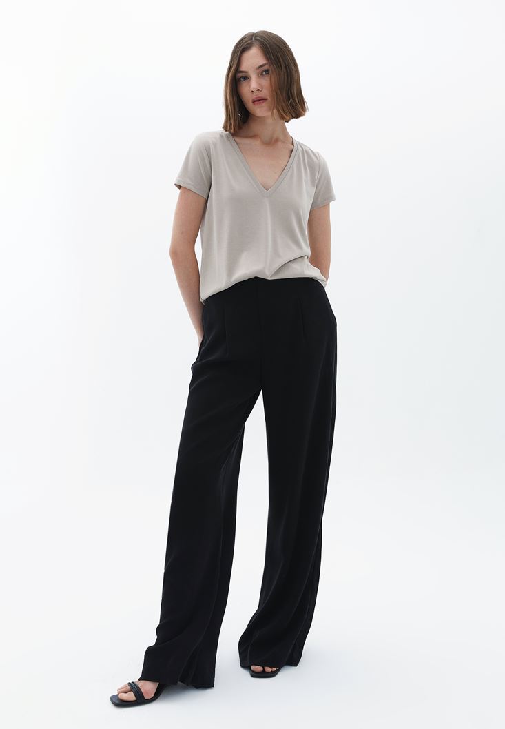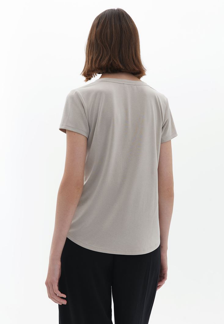 Modal karışımlı özel Soft Touch doku, kısa kollu, V yaka, bedenden uzak rahat fit, standart boy.