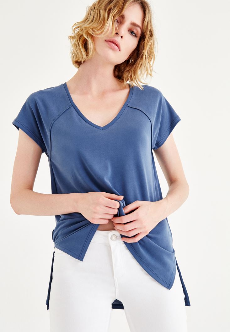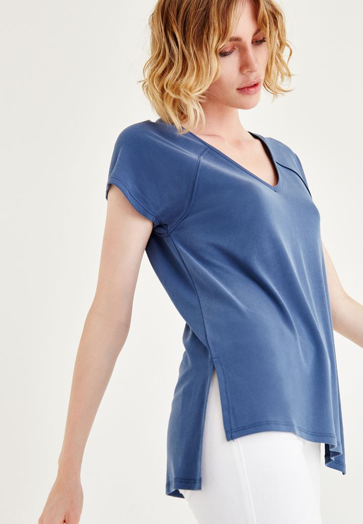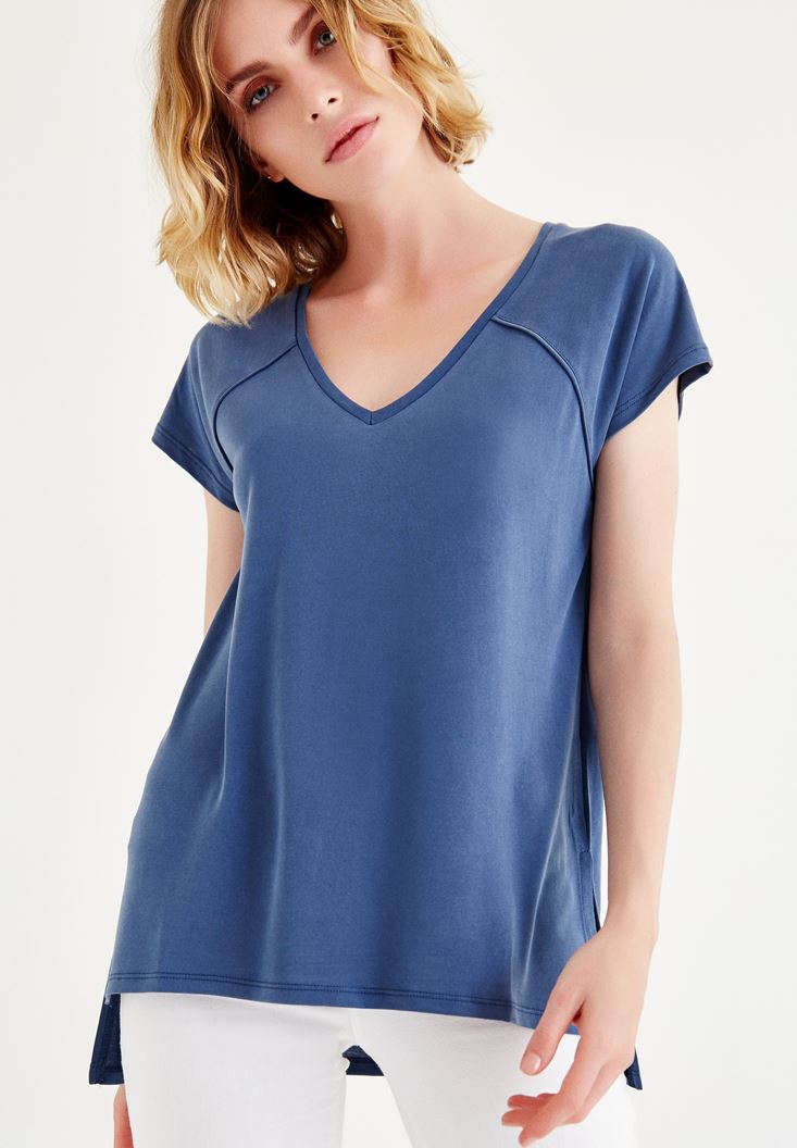 Mavi Yumuşak Dokulu V Yaka Tişört