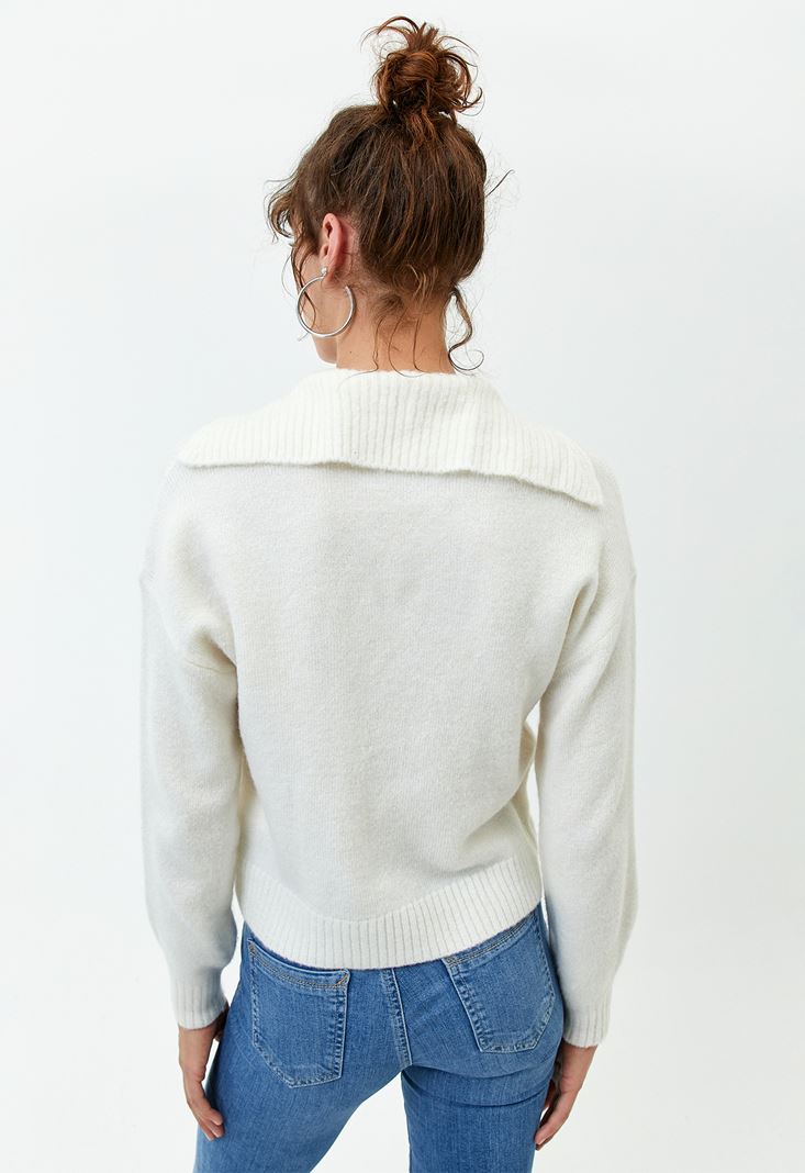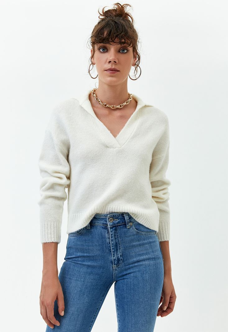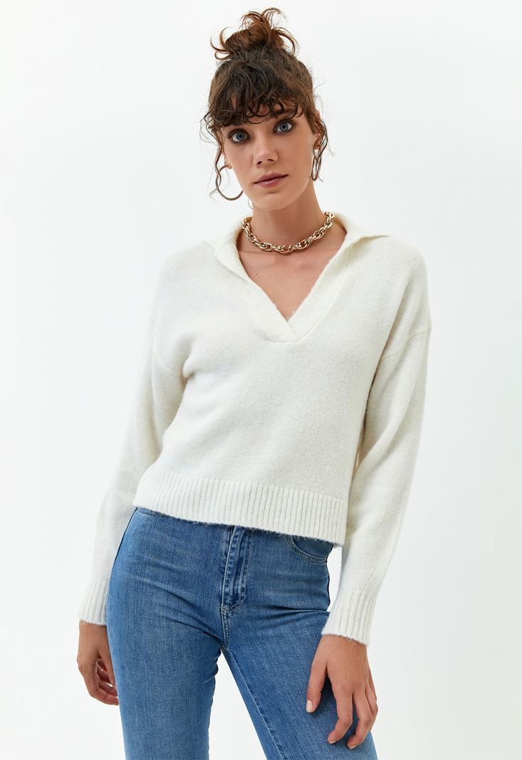 • Bayan Krem Yumuşak Tuşeli Polo Yaka Triko