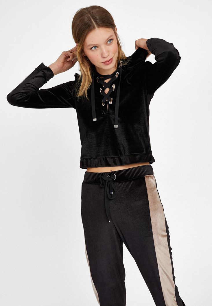 Yumuşak Tuşeli Sweatshirt modeli, hoş dokusu ve parlak kadife görünümüyle sizlere sunuluyor. Crop kesim kadın sweatshirt modeli, V yaka detayında bulunan ipler sayesinde kapüşonlu sweat modellerine yenilik getiriyor. Spor şıklıkla iyi görünümü bir araya getirmek için kadın sweat modeli ile kadın jogger pantolon modelleri kullanarak, fark yaratan kombinler yapabilirsiniz. Kadın sweatshirt modeli ile kadın skinny pantolon modelleri tercih ederek, trend olan sportif şıklık akımına uyum sağlayabilirsiniz. Kadın sweat modeli ve sneaker ayakkabı modelleriyle tamamlayacağınız kombinler sayesinde fazlasıyla dikkat çeken bir stile sahip olabilirsiniz. Oxxo'nun farklı detaylar ile ilgi çekici tarzlara yönelten kadın sweatshirt modelleri ile sokak modasında yankı uyandıracak bir stil yaratabilirsiniz.